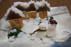 「暮らしニスタ」の大根おろしアート募集に乗っかりました。 雪景色に雪だるまです ママと僕です (男の子と女の子に作ったのですが、、、)