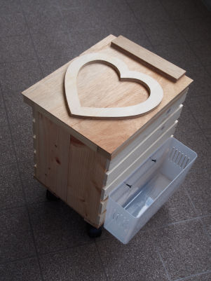 いつも大小二種類のほうきを使い分けています。 使い終わると、壁に立てかけていましたが、、、 きれいに収納できないかなと、、、、、こんなのを作ってみました!! ふたを開けた状態ですふたを取り外して、ポリ袋を挟めますこれでスッキリ!!!キャスターを付けてラクラク移動できます