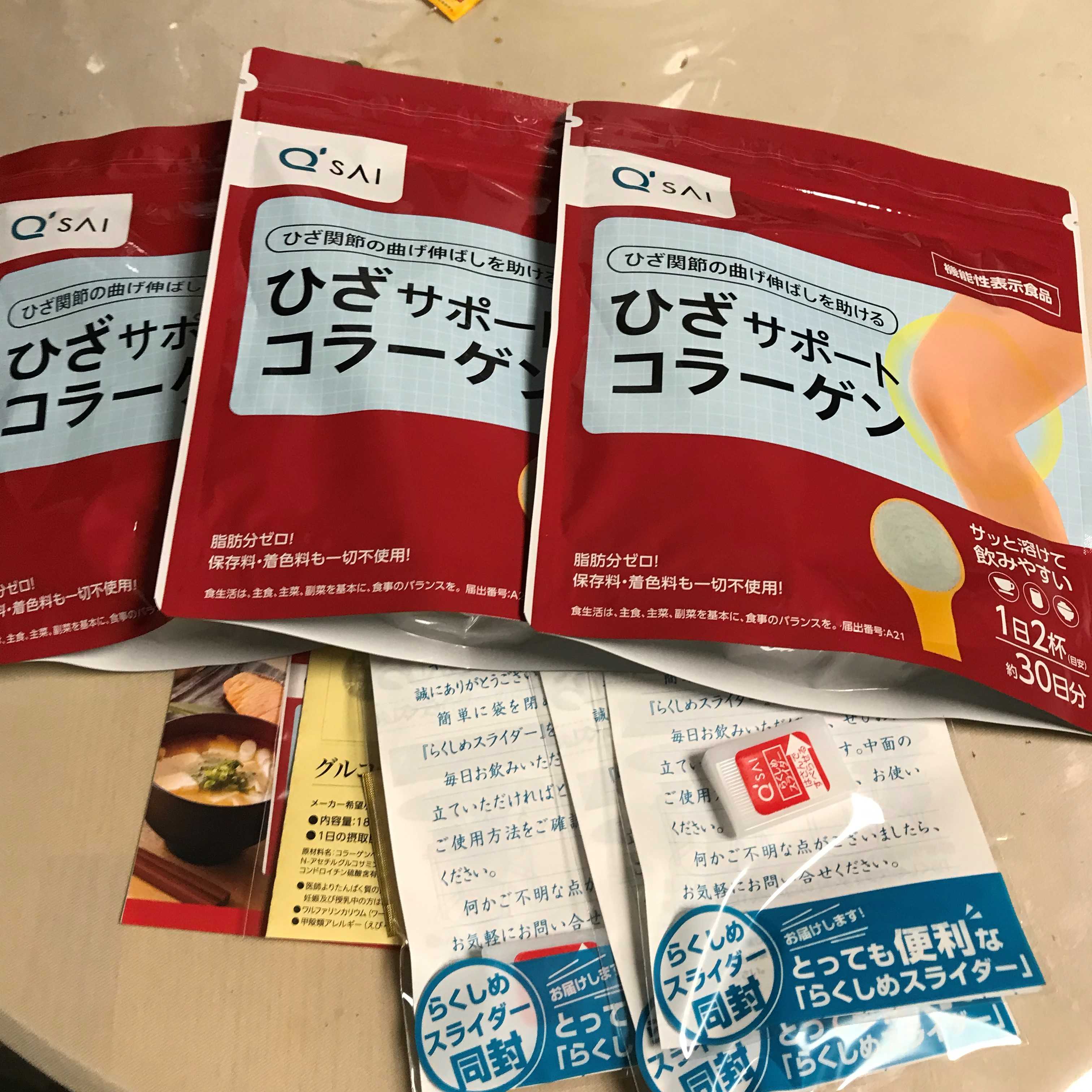 キューサイ ひざサポートコラーゲン 150g 3袋まとめ買い おまけつき ひざコラ ひざこら楽天で購入 2年前位前にマンションの階段で「ギクッ」となって膝を痛め次の日歩けなくて 友人が手伝いに来ました。それから今は高齢者ならぬスタスタ歩き回っているので 驚いた友人が「何をしてるのよ」と問いただした。 自分は朝、昼、晩と食事はしているけれども若い時のように水気がない自分に何とか と思って、医者ももう来なくて良いと言われたし、かといってこのままではカサカサの 自分なので、色々調べて、他から「ひざコラーゲン」購入していた話をしたら友人も 欲しいということで注文になりました。 ※ ひざコラーゲン 膝の曲げ伸ばしを助ける、機能性表示食品です。 3つの軟骨成分、コラーゲン・ヒアルロン酸・コンドロイチンを1つで摂ることが 出来ます。長く続けるのがコツ 1日2杯 届きました。 中の状態 昨年の12月に友人も食事に取り入れたようで、お気に入りのようです。 高齢になるとどうしても不足なものが出てきます。