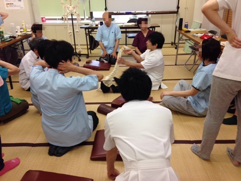朝いちばんのお客様への「おはようございますっ」が、たまたまその日の第一声だったとき。自分の声が鼻に響いた刺激で、くしゃみが出たり、しばらく鼻がズルズルしたりすることがあります。一晩寝ているうちに乾いて敏感になった鼻の奥に、こよりをつっこんでコソコソするような作用があるのでしょう。「先生、風邪ですか?」「花粉症ですか?」と心配をかけてしまうことがあるのは、こんな事情でした。起床から開院の時間まで、内容をブツブツ声に出しながらブログを書いたりしたあとは大丈夫。鼻粘膜にとって、よいウォーミングアップになるようです。先週末から、「身体均整法学園」27年度隔週土日コースの担当授業「自他動操縦法」が始まりました。翌日は快風院の定休日。遅めに起きてボーッとしていると、常連のお客様からお電話が。2日間しゃべり続けたせいか、少し声がかれていたらしく、「先生、風邪ひかれましたか?」と心配していただきました。「ありがとうございます、実は授業で……」とお話しして電話を置くと、もう一度ベッドに横になり、声がれのときの調整ポイント「恥骨」を自分で調整。ちなみに、鼻ズルのときは、お客様のお着替えを待つ間「内くるぶし」を、じーっと押さえています。内くるぶしといえば、小学校に上がる前、婦人雑誌に載っていた「おねしょを治すツボ」もその付近。内くるぶしを頼りに探し出し、つまようじでチクチクして、自分で治しました。恥骨もくるぶしも「骨」ですね。均整師としては、さらに背骨や骨盤が大事。私が5歳の頃から磨きあげた触診能力を、背骨模型を使って、あますところなくお伝えしているシーンです、なんて。(『身体均整法学園ブログ』土日コース7月5日授業風景より)解剖生理学他、基礎的な科目を終え、ここからは背骨の何番を触っているのかなど、実際にお互いの体を借りて、ひたすら練習です。その後はさらに筋肉、内臓、経絡etc. へと触診(観察)、そして調整法習得は進みます。夜間1年コース担当授業も、今月後半から毎週月曜、本格的に始まります。1年後、2年後に、目の前の方の調整ポイントにためらいなく手が伸びるよう、一緒にしっかり身につけていきましょう。無料イラスト「イラストわんパグ」さんより