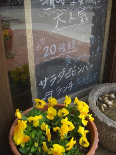 ここ数日、暖かい日がつづいていますね。気持ちいいです~♪ テンションもあがり、やる気モードいつも金泉の野菜を買っている八百屋さんでパンジーを大量買いしましたので、店先に植えました。黄色のパンジーが、あなたをお出迎えいたします(*^_^*)さてさて、かねてからやりたいと思っていた、韓国雑貨販売まずは、手始めに・・こんな感じで、飾ってみました~。生活の中に、さりげなく韓国テイストを取り入れて、楽しんでくだされば幸いです^^4月には、もっとたくさんの種類をご紹介できるとおもいますのでぜひぜひ、楽しみにおまちくださいね。3月24日から、韓国へ行っていろいろなものを持ち帰ってくる予定です。雑貨ものだけではなくて、いろいろと・・ 今から、すっご~く楽しみです さてさて、これはほうれん草。中国野菜の冷凍では、ございません!おじいさんの畑でとれた、安心できる心のこもったホウレンソウ 今日と明日で、おじいさんの畑の収穫分は、おしまいだそうです。採れたてを、さっと茹でて、私たちスタッフが丁寧に冷凍保存しておいしい~ピビンパに変身させてます!これからの季節は、野菜たっぷりのサラダピビンパがおすすめ熱い石焼ピビンパしかしらないなんて、もったいないですよ~これからの季節は、サラダピビンパに限ります! 金泉でした。