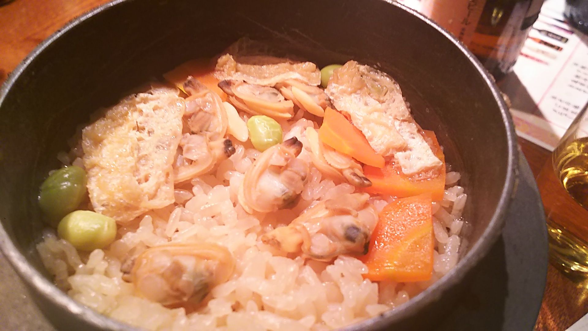 〆は、釜飯。銘々の釜を固形燃料で炊き上げるスタイル。アツアツのあさりご飯風炊き込みご飯。こういう釜、家にあってもいいなぁ。