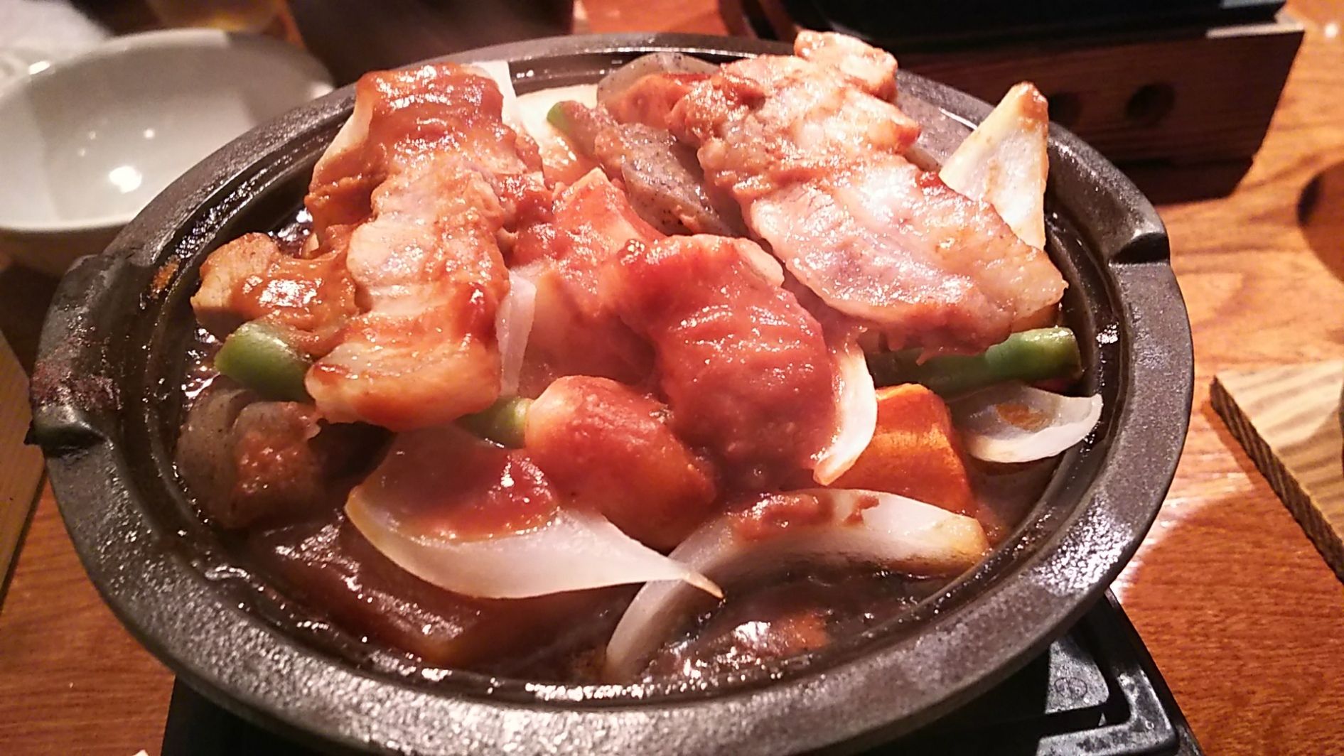 豚肉の八兆味噌陶板焼き。肉の下には、じゃがいもとかも入っていて、ボリュームがある料理です。