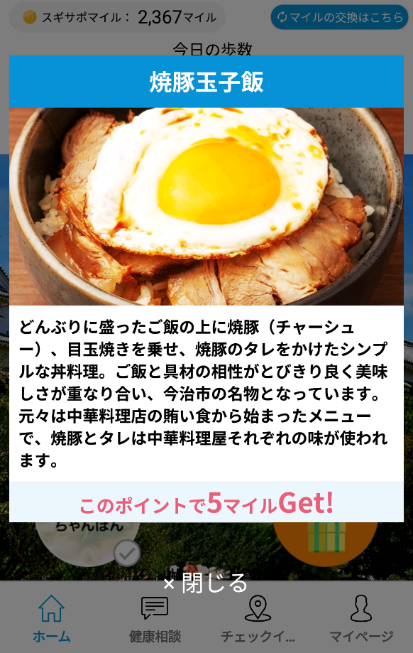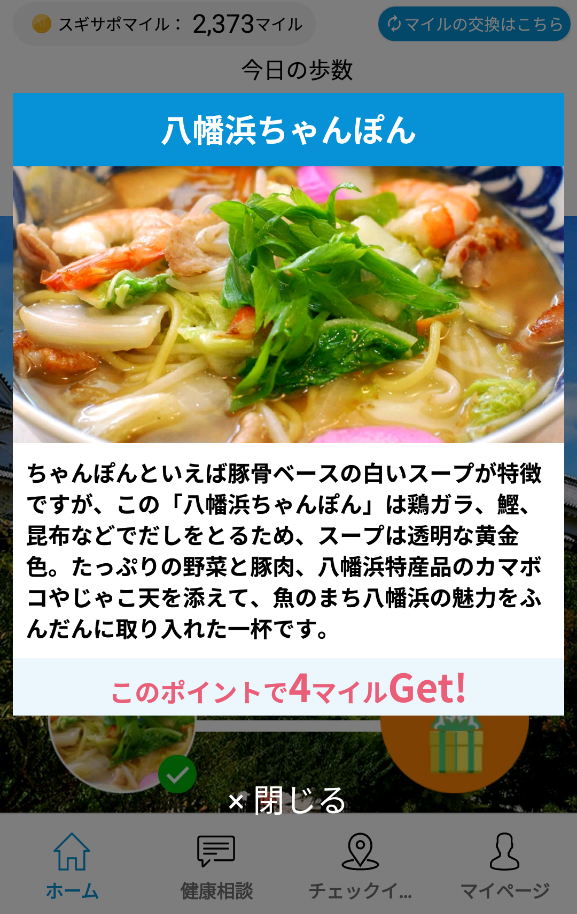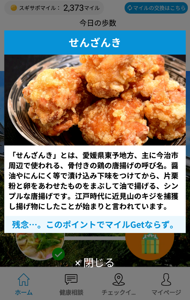 スギサポウォークというアプリなんですが、6千歩歩くごとに、郷土料理が出てきます。
