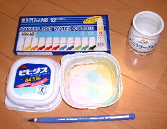 12色の絵の具と平筆1本を買い、パレットと水入れは、ヨーグルトのパッケージを利用した。