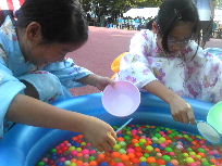 風船ヨーヨーやスーパーボールすくい、くじ引き、輪投げの遊びのコーナーや、焼き鳥、トウモロコシ、焼きそば、磯部餅、綿菓子などの食べ物のコーナーも。