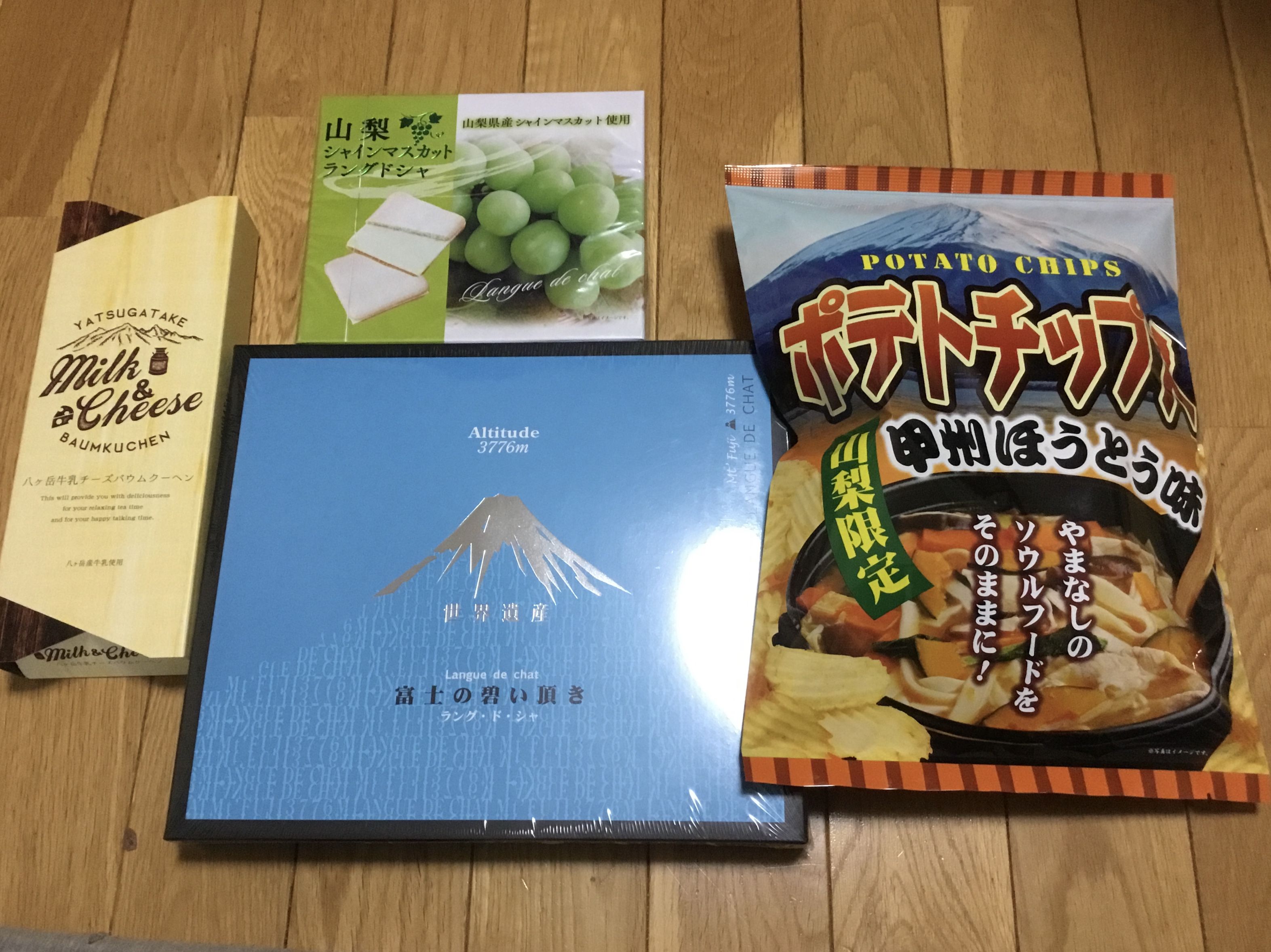 本日到着しました。観光地応援の山梨県コミコミ1000円のものです。早速ネタバレしますよー購入したのはこちら【観光地応援】【山梨県】/ワイエムカンパニー ご当地スイーツコミコミ1000円セット 期間限定 お菓子 山梨 おみやげ 【訳あり スイーツ 送料無料】【送料無料】※商品画像に入っている商品はイメージです。富士の碧い頂きラングドシャ 賞味期限 6月20日 1080円山梨シャインマスカットラングドシャ賞味期限 5月16日864円八ヶ岳牛乳チーズバームクーヘン 賞味期限 5月10日 540円ポテトチップス甲州ほうとうあじ 賞味期限 5月28日 432円4点の合計2916円でした。私は23日に購入しました。岐阜県のセットよりさらにいい感じの内容ですね。マスカット味のラングドシャやほうとう味のポテチなんて、なかなかこちらではお目にかからない商品で大満足です我が家到着分は賞味期限もそこそこ長いので、お店の方赤字ですよねぇ。食べた事の無い物ばかりで、山梨県行った事が無いので、楽しみますね。観光地応援セットハマりそうです。現在はこの3商品の在庫が復活中です。コミコミ1000円なので、群馬県いっていようかなぁ。