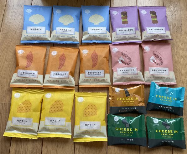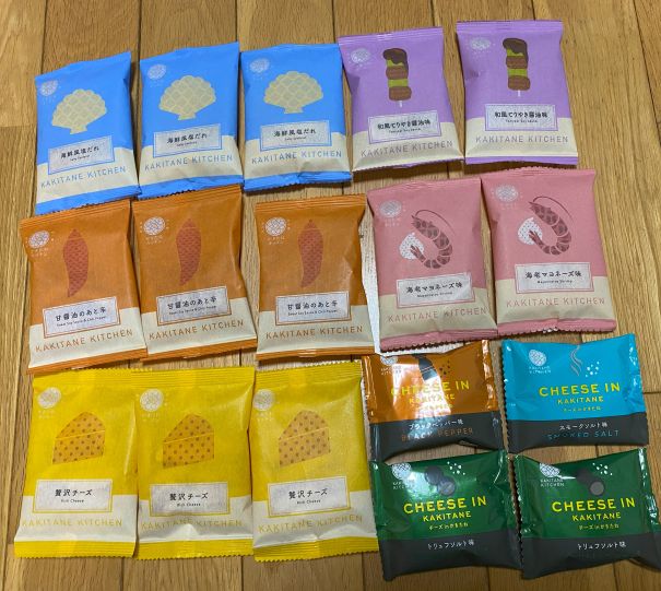 ・海老マヨネーズ・てりやき醤油×2・チーズインかきたね(スモークソルト・ブラックペッパー・トリュフソルト×2)