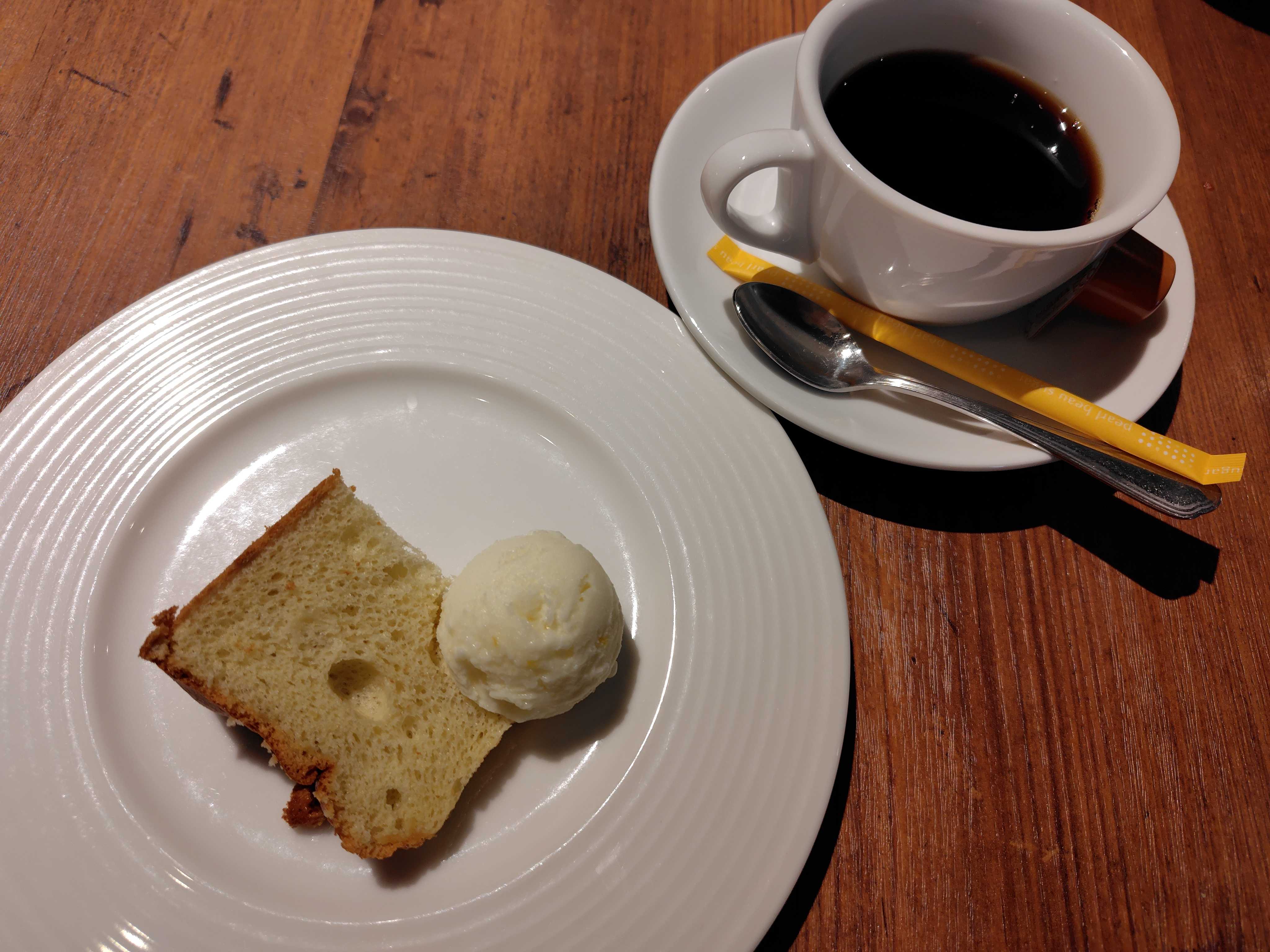 シフォンケーキと柚子シャーベットのデザートとホットコーヒー。