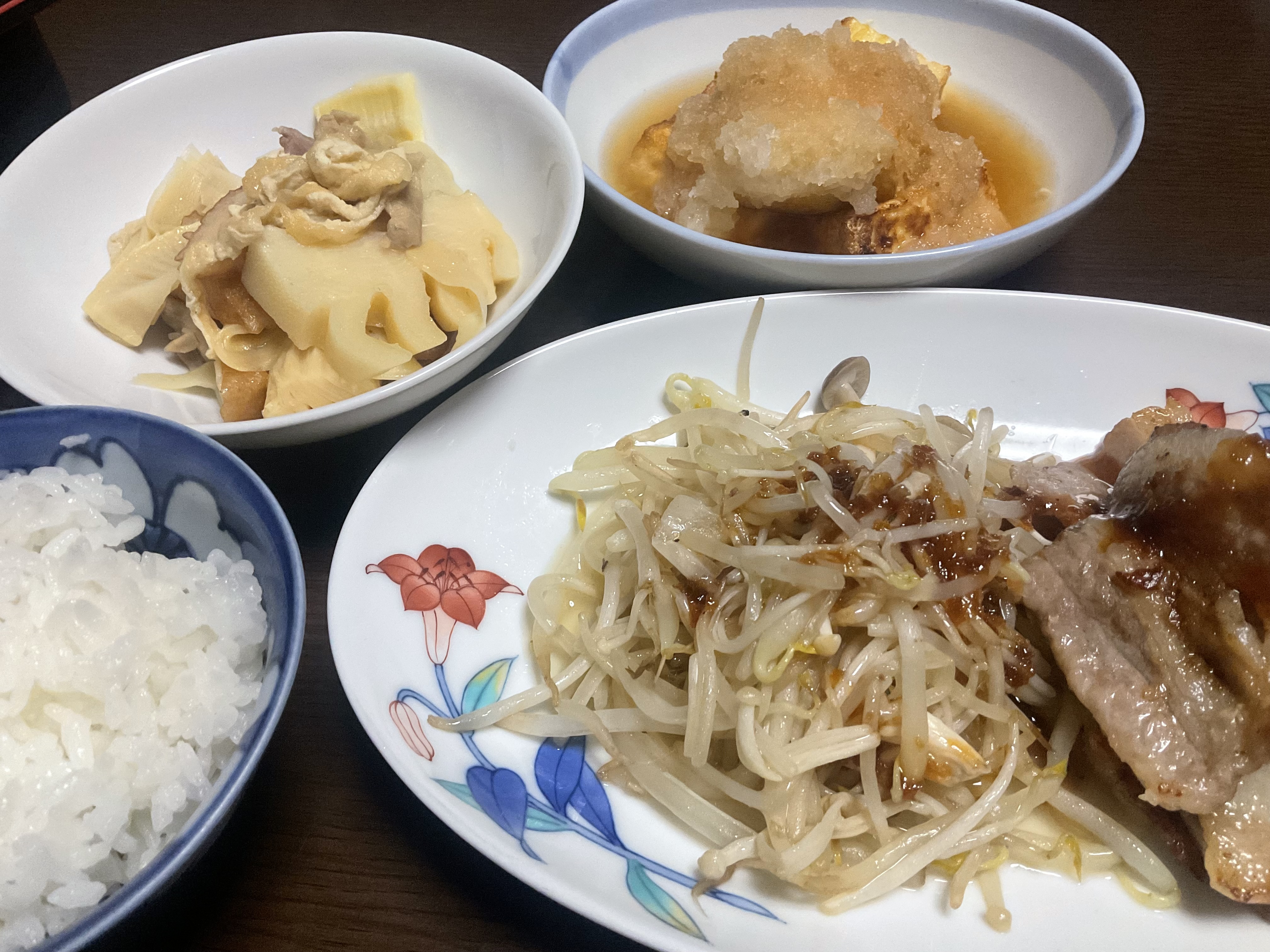 おばんです今日はちょいとお出かけして、ついでにドラッグストアに寄って、確か冷蔵庫にキムチがあったから、豚キムチにしよう‼️と決めて豚肉買って来たダニ家に帰って冷蔵庫を開けたら、……そこに、キムチが存在しなかったこんなこと、ありがちよねしょうがないんで、夕方、スーパーに行きましたともああ、ガソリン代がもったないそのような夕飯です豚肉焼いてみました モヤシも大量に 揚げ豆腐は焼いて大根おろしにめんつゆですあとは、タケノコの煮物大根は半額ゲット54円でした😉タケノコはもらい物で、1人前250円の夕飯となりましたあ、豚肉は30%オフです📴ごちそうさん
