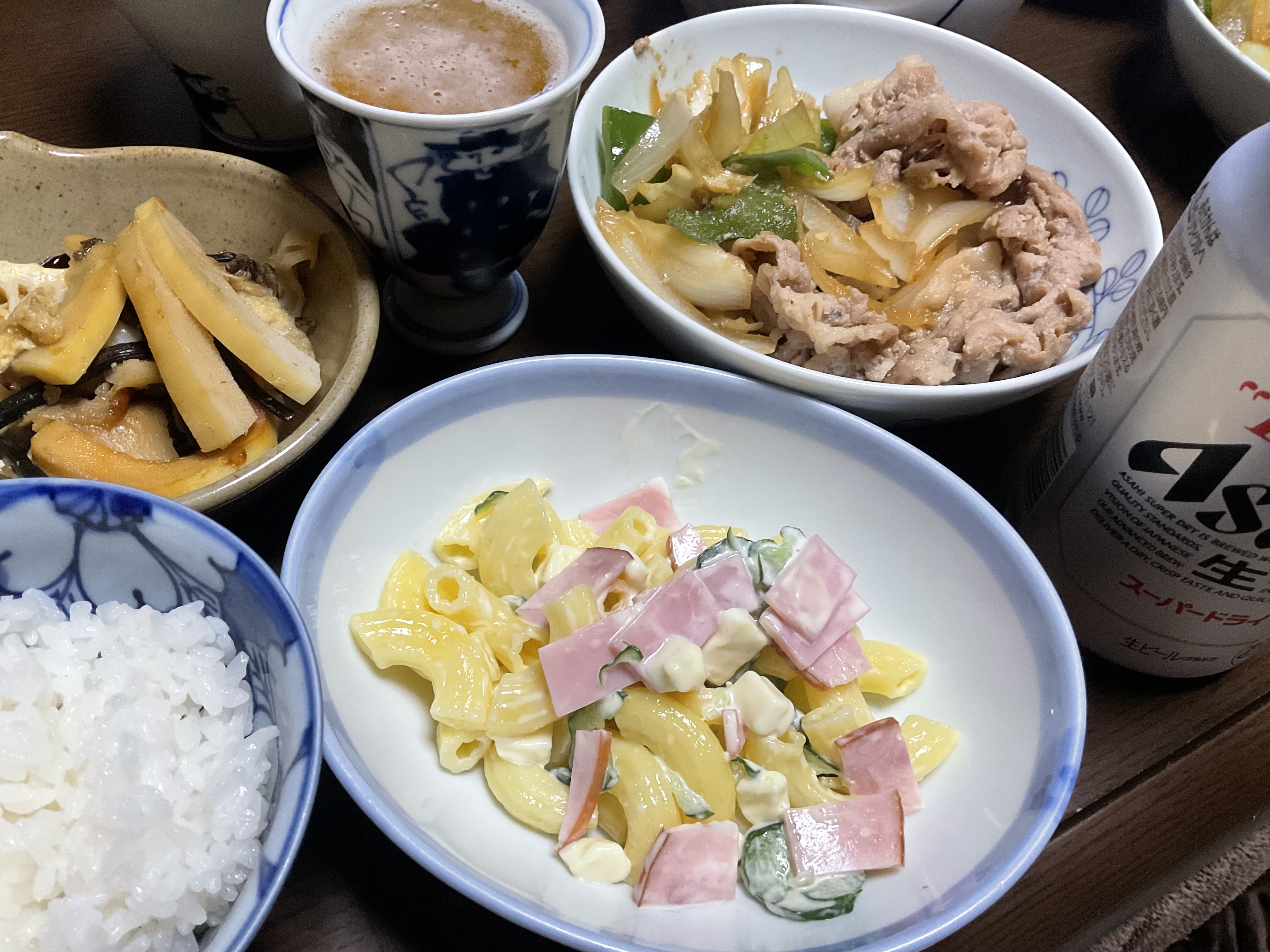 おばんですゲコですが、たま〜に飲みたい日もあるとですとはいえ、飲んでも、小さなワイングラスに2杯がせいぜいなのです燃費いいなあと思いますタケノコと蕨の煮物 豚の生姜焼き マカロニサラダ🥗このごろ、豚と鶏ばっか食べてます🐔牛肉には手が伸びない年金生活です