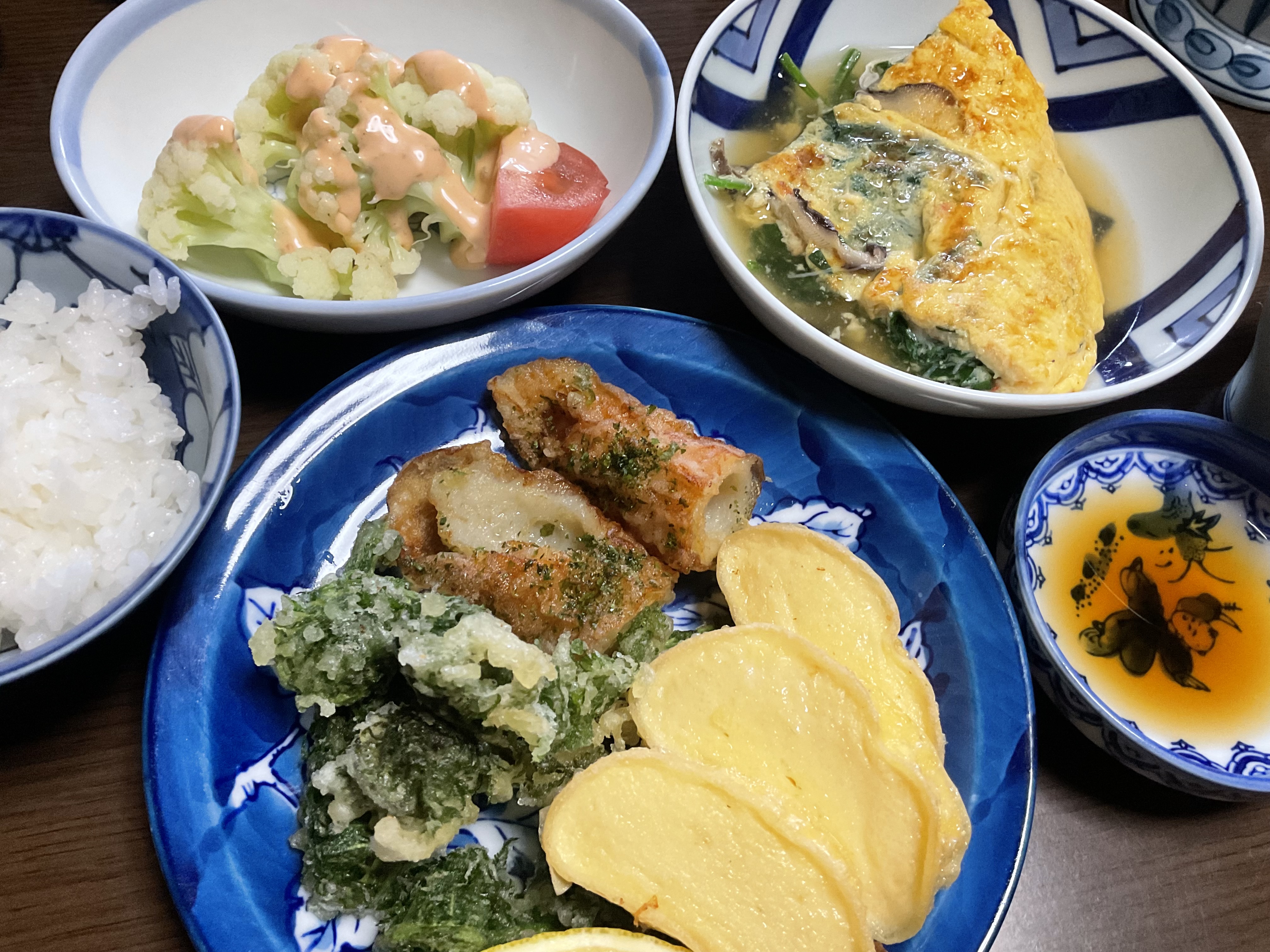 おばんです先日山に行った時に、道の駅でこごみを買ってみましたひと束150円だったもので☺️天ぷらにすると、美味しいんですよねこごみの天ぷら ちくわの磯辺揚げ 湯葉揚げ カリフラワーサラダ蟹玉🦀カリフラワーも道の駅でお安くゲットちくわと湯葉揚げは、いただきものですほうれん草は自家製この中で一番お高いのは、蟹缶ですが、これもデパ地下のギフト解体セールにてゲットしたものです美味しいものを、なるだけ安くをモットーにこの値上げラッシュを乗り切ろう