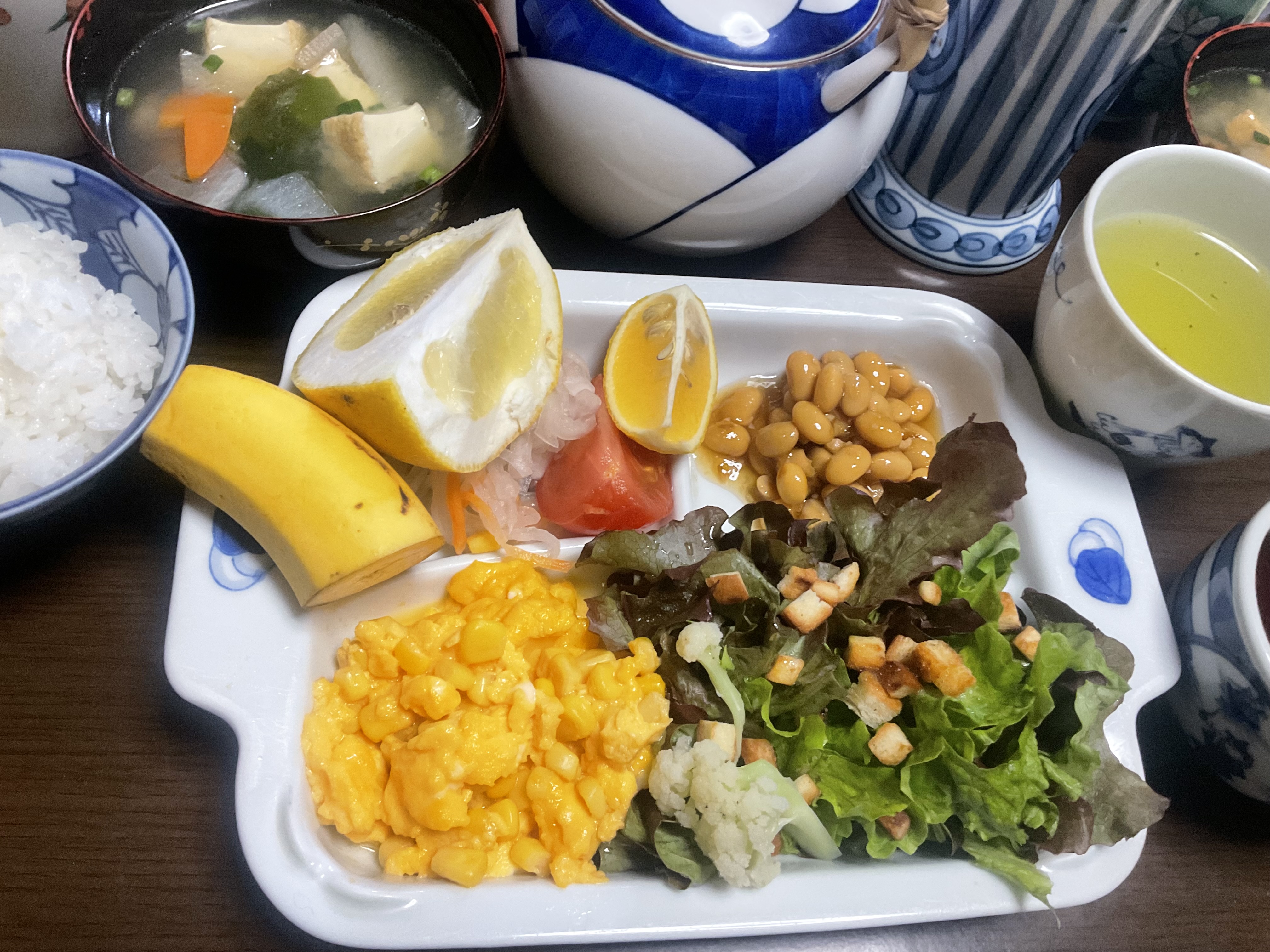 おはようございます😃なんでも、関西万博が今朝9時に開幕したようですね万博行ってみたいけど、人、多いんでしょうなあとか思いながら食べた朝ごはんですコーン入りスクランブルエッグ サラダ🥗 なます ぶどう豆 味噌汁サラダには、レモンとオリーブオイルをかけましたレモン、🍋レタスと大豆、ニンジンは自家製大根はもらい物です少しでも安くしたいと、頑張っております