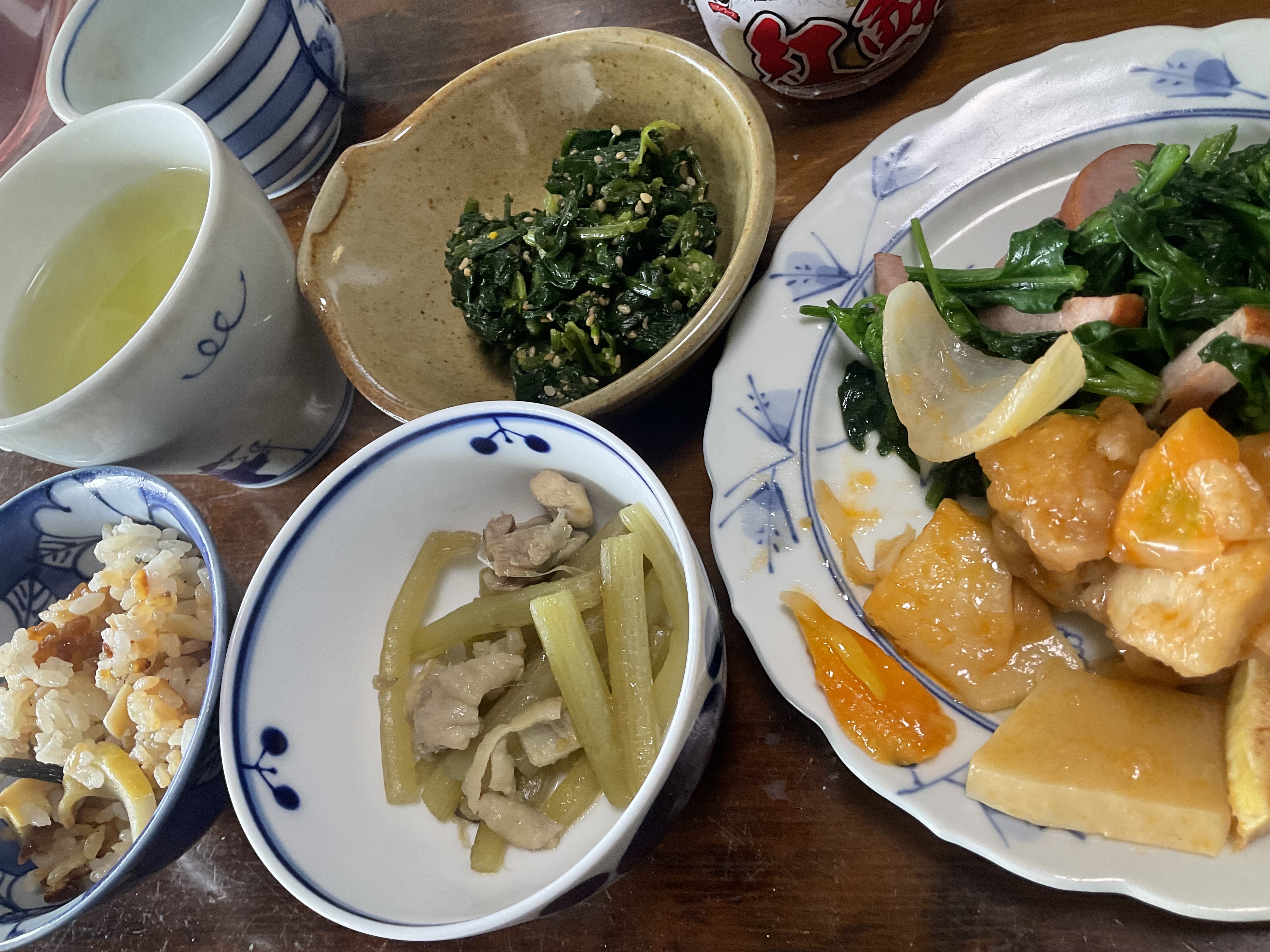 どもです今日のランチ当番は私🍙冷蔵庫に残り物がたまっていたので、それを消費することに‼️タケノコごはんに、蕗の煮物 ほうれん草の炒め物 ほうれん草の胡麻和え 酢鶏残り物があると楽ではありますが、暖かくなってくると、食中毒🤮が怖いですね先月の嘔吐下痢から、なんか怖くてたまりません