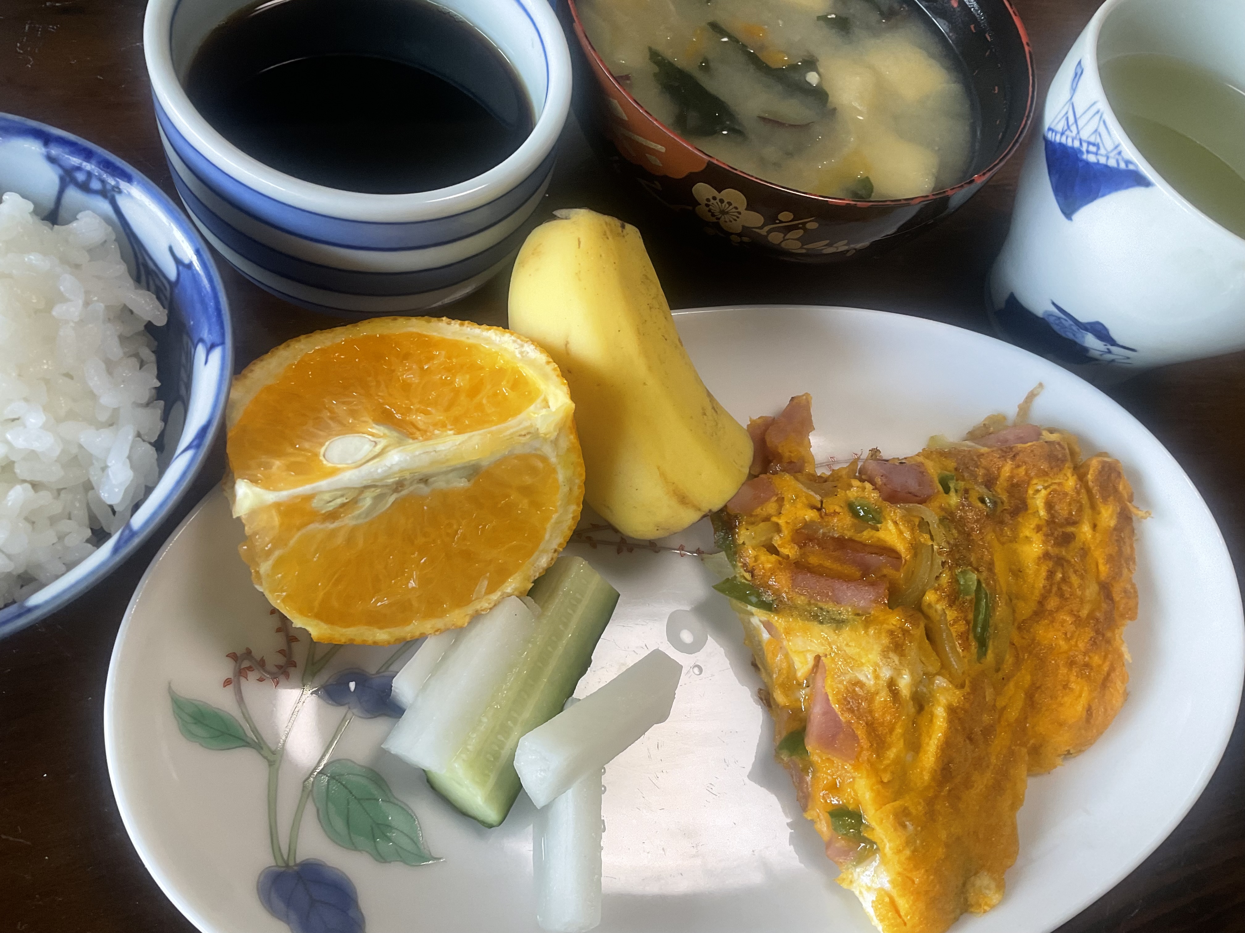 おはようございます😃昨日は結局、一日中草取りやってまして、疲れ果てて寝てしまいましたで、今朝は筋肉痛で起きれず……私も体力落ちたもんやなあそのような朝ごはんですオムレツ 酢漬け 味噌汁今日も家の周りの草取りだなあGさまは昨日も今日も田んぼの畦の草取りですごくろうさん