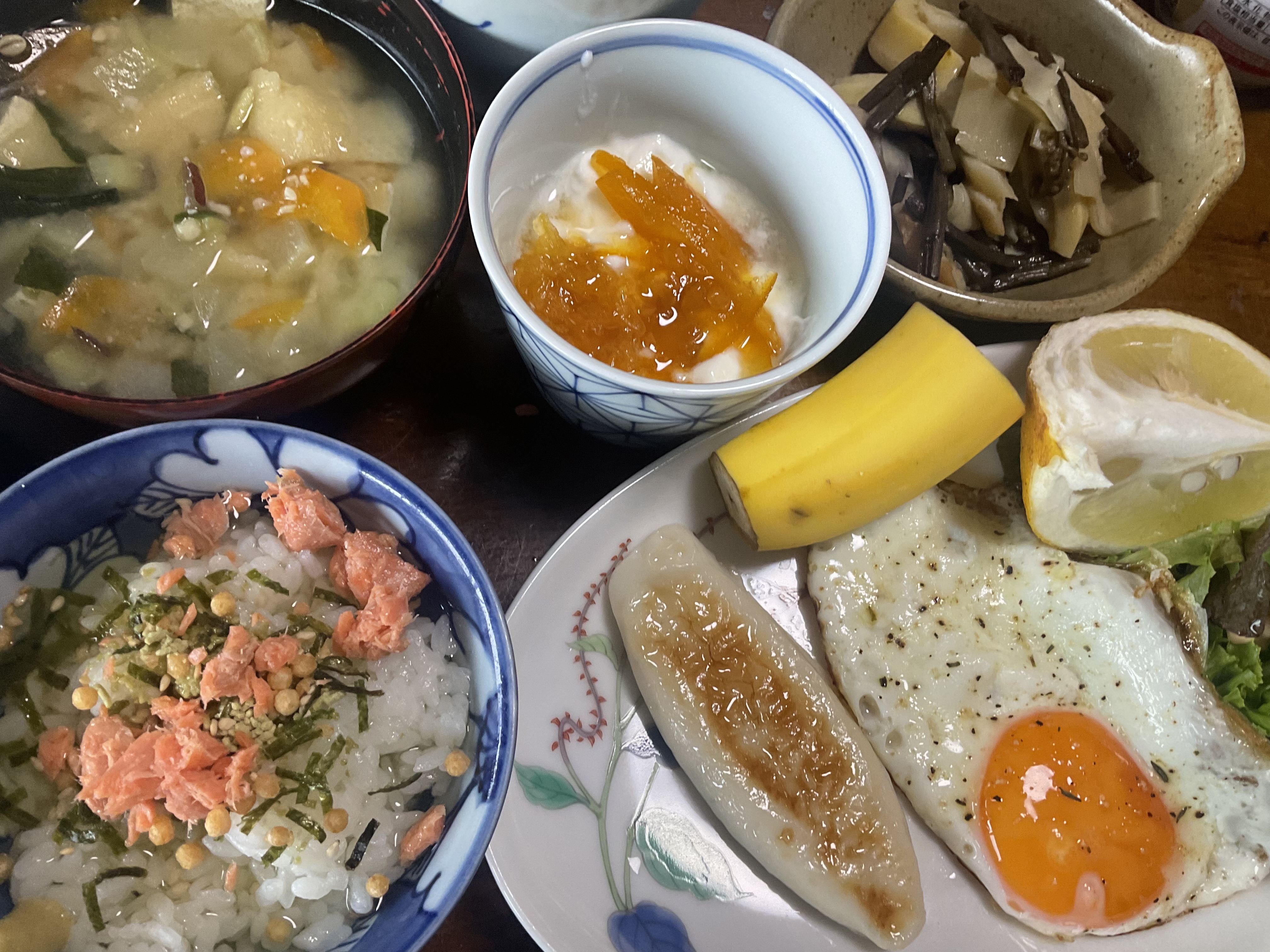 どもです朝唐子どもが咳してるんで、風邪ひいた? と、小声で囁いたつもりが、しっかり聞こえていたようで、「風邪ひいてない」と、否定されましたが…ずっと、咳が聞こえてきますそのような朝ごはんです目玉焼き🍳 笹かまぼこ レタス タケノコの煮物 味噌汁 ヨーグルト冷やご飯が大量だったので、ごはんは炊いていませんので、お茶漬けに。お茶漬け、大好きなんですよ〜〜笹かまぼこは昨日半額ゲットの残りですヨーグルトも半額もはや、シールのないのが見当たらない冷蔵庫でございますごちそうさん