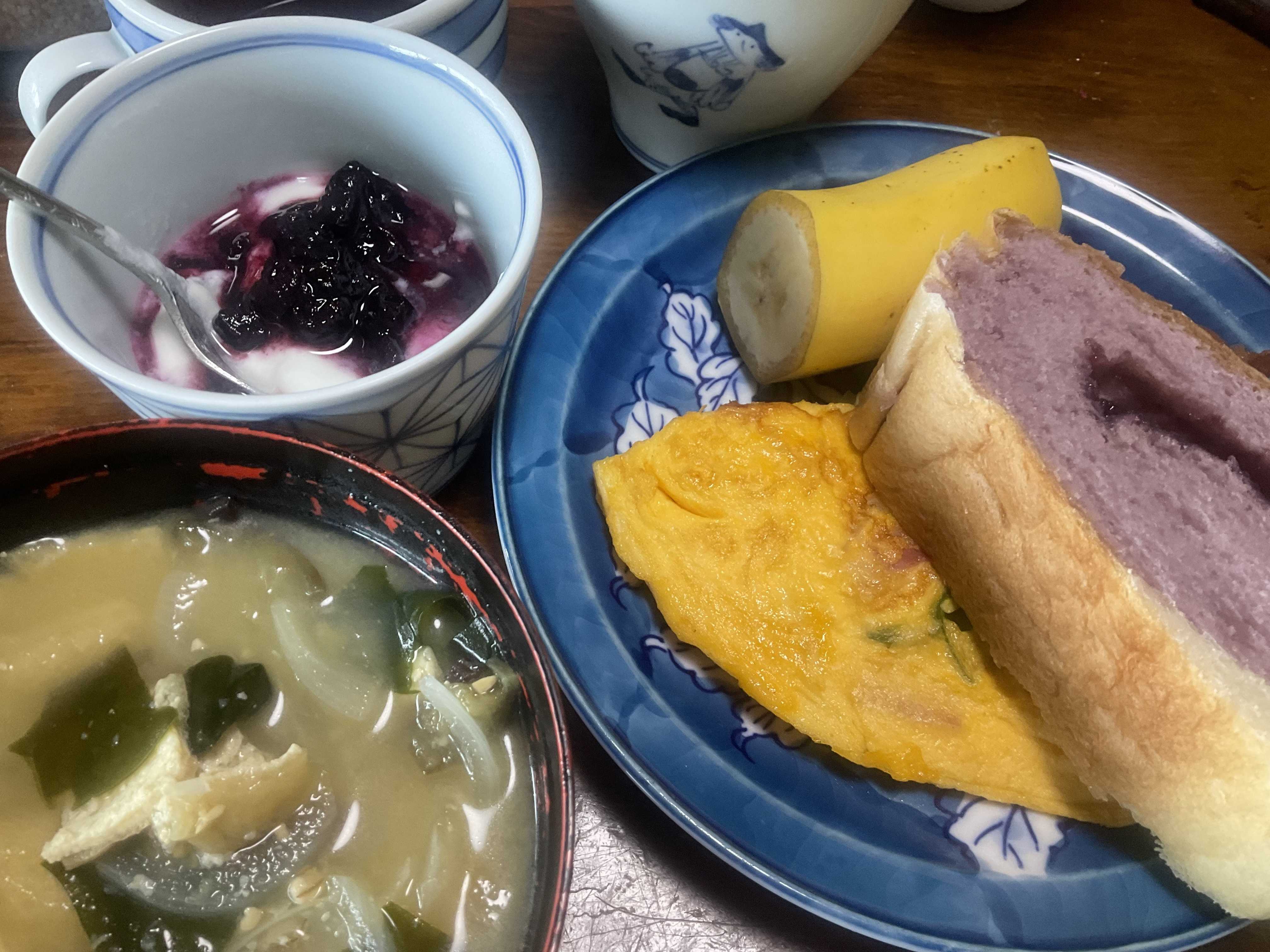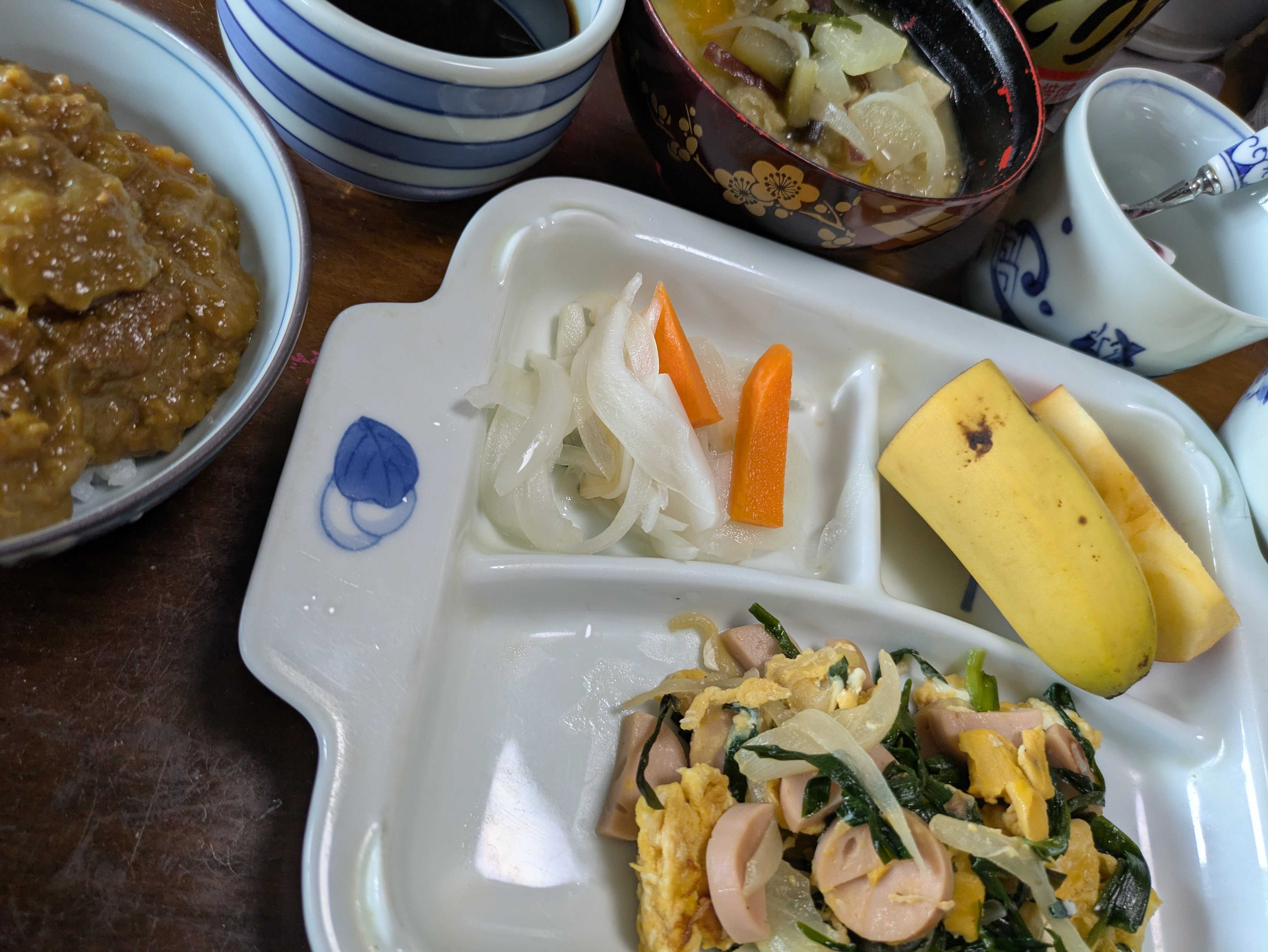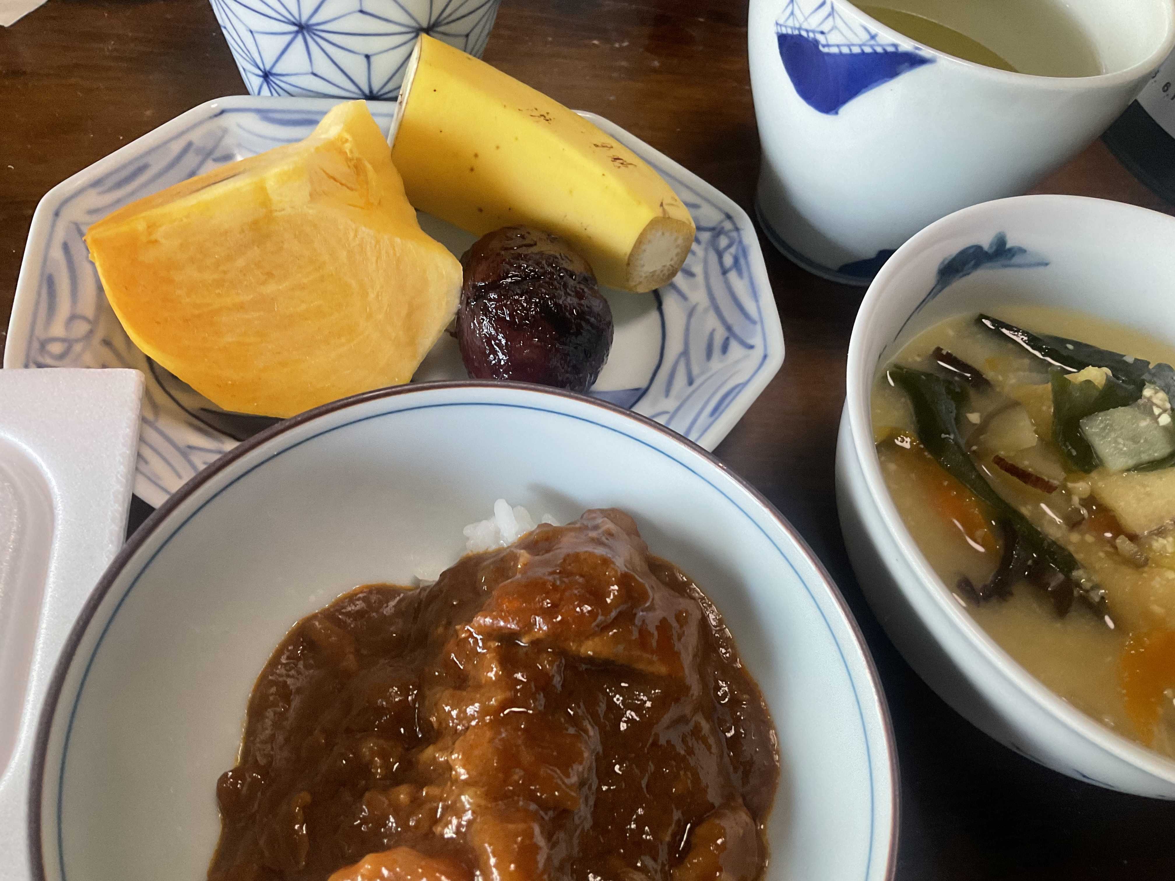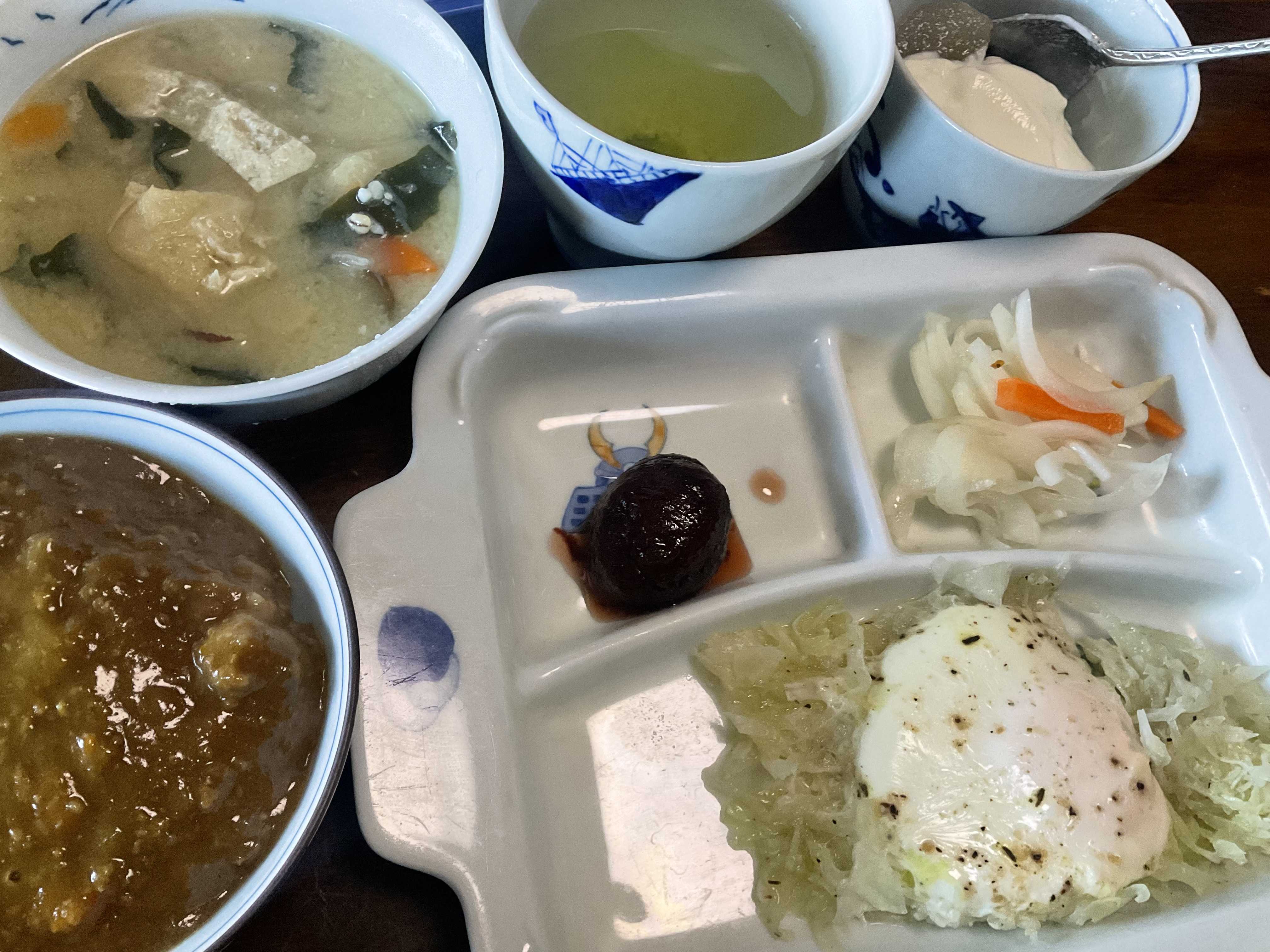 どもですこの頃カレーがあまりがちで、今日も朝からカレーです巣篭もり卵 味噌汁 カレー🍛 ヨーグルト栗の渋皮煮がすごい美味しい😋