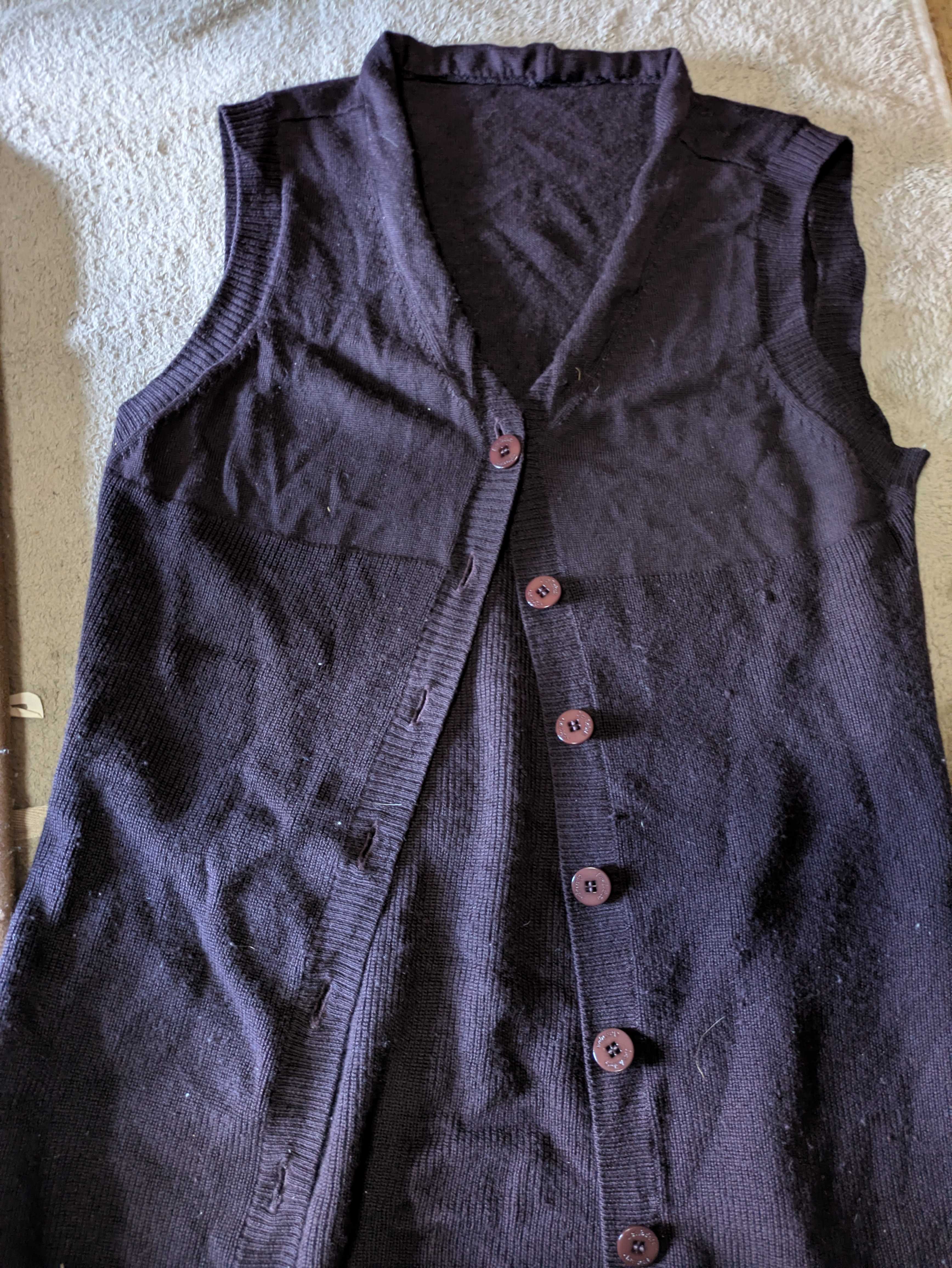 こんちゃです✨朝から、21年前に買ったウール100%🐑のフード付きニットベストを、普通のベストにリメイクしてたのてすが、一応の完成を見ました首周りはまあ、変ですが、上着の下に着るぶんには、問題ない!?!?さっさと捨てればいいのですが、何分ケチなんで、買ったものは使い倒さないと気がすまぬそれに、色が気に入ってるの笑ってください