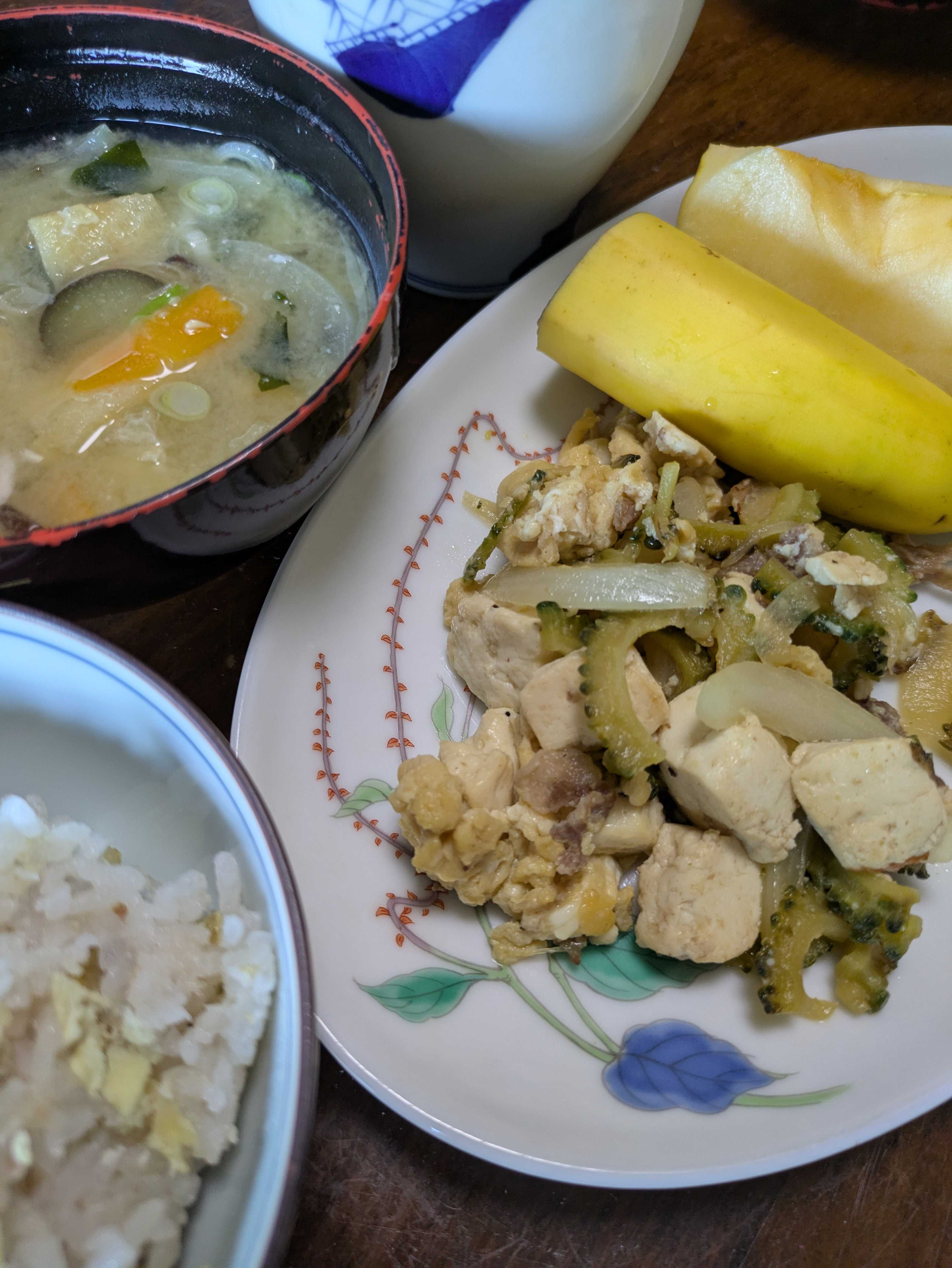 こんちゃです✨10月になっても30度、暑いなあと思いながらふと気がついた2階はエアコンていてるけど、私らのいる階下はエアコンは9月半ばからついてないもちろん痩せ我慢もありますで、ふと、エアコンついてないと孫ちんが降りて来ないと気がついたもう、暑いけど、うるさいよりずっとマシと思う休日ですわ〰️😸昨日の栗ごはんの残りよあとは、ゴーヤチャンプルーうちのゴーヤチャンプルーは甘めです味噌汁にフルーツもねりんご美味しくいただいてます💓