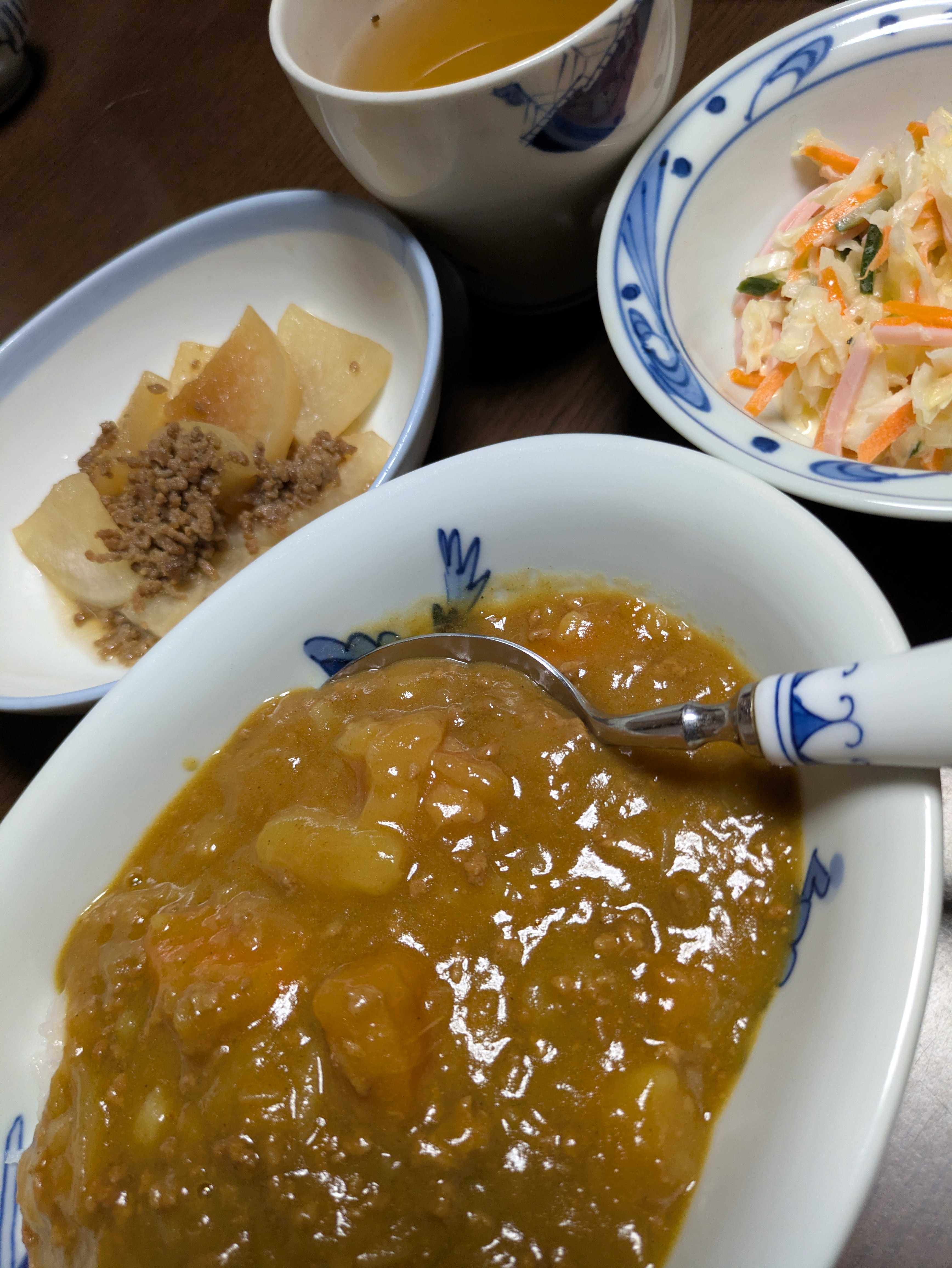 おばんです月曜日はカレーと決めていますで、うちのお肉は挽き肉です節約もあるけれど、うちのひいばばときたら、かたまり肉を入れると、お肉ばかりてんこ盛りに食べて、翌日から胃が悪いと言い出すんですの欲張りすぎだっちゅうので、一カ月はカレーごおいしすぎるからとか言いながら、胃が悪いと言い続けるのもう、勝手にしてくれと言いたいが、お粥作るのも面倒なんで、挽き肉にたどり着きましてんついでに、大根の煮物もひき肉で…結局、節約なんだな