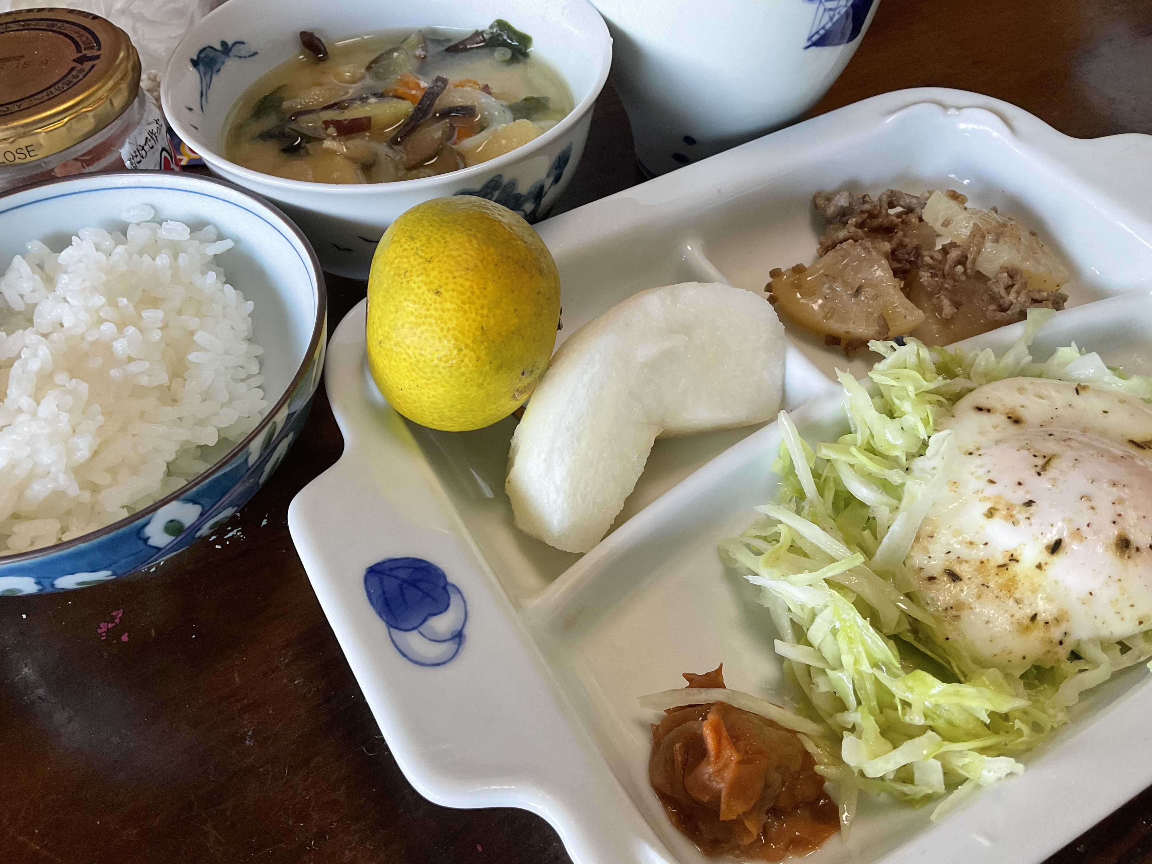 どもですこの頃の朝ごはんですこれは昨日ですね巣篭もり卵 味噌汁 梅干し フルーツみかんは割引シールでゲットです♪今朝は目玉焼き 味噌汁 残り物チャーハン母は幾つになっても、残り物を食べ続ける運命です母って、なんだ?