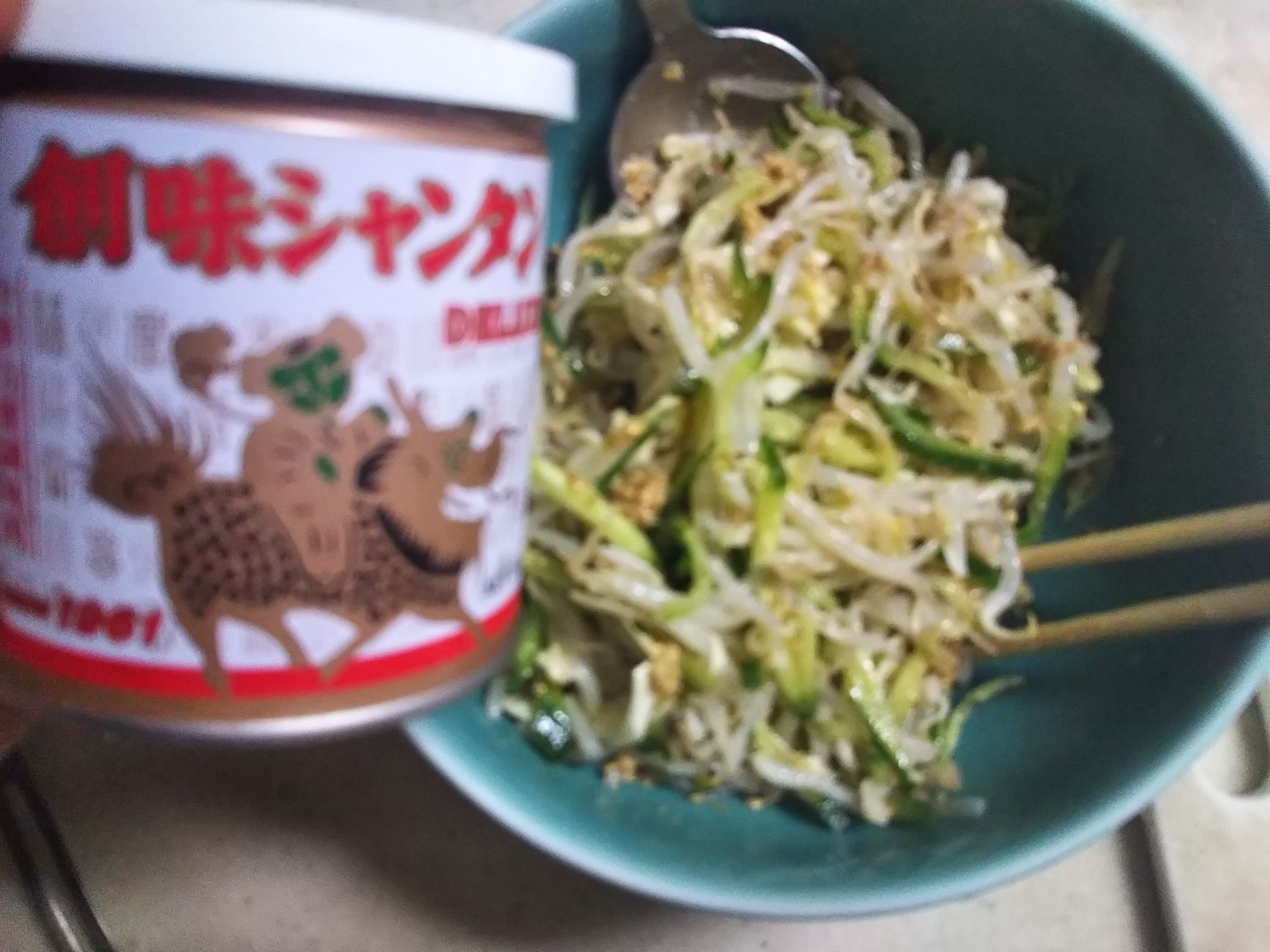 創味シャンタンを使って、モヤシとキュウリのナムルです