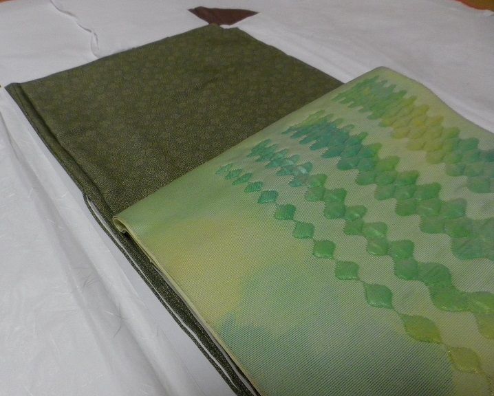 昨年に引き続き市民講座の着付けと、今年は新たに和裁にも通うことにその開校式が土曜日にあります。せっかくなので、開校式には着物で出席することにしました。開校式と言っても、市役所の職員と講師の先生方がスーツもしくはきれいめの服で、生徒の皆さんは普段着~きれいめカジュアルの服での出席と、あんまり格式ばったものではありません。その中で浮かないように着物を着るなら、小紋や紬などのカジュアルなものから色無地くらいまでがいいでしょうか。あっ、それでいて春らしい装いにできれば最高ですねそれで候補として、以前書いた色無地コーデ の2枚(グリーンと桜色)のどちらか、もしくはクローバーの小紋で考えています。まずは、一度も袖を通したことのないクローバーの小紋から、もともと候補に考えていた3本の名古屋帯でコーデの確認です。○手織り八寸名古屋帯 ○レトロ調の赤い名古屋帯 ○ふくれ織りの名古屋帯 う~ん、手織りの帯はやけに落ち着いた感じでちょっと暗すぎる気もしますね赤い帯は無難な感じでしょうか?膨れ織りの帯は、着物と同系色ですが明るい色なので雰囲気が少し春らしくなりました。3つのコーデの中ならふくれ織りが一番春らしいですねただ・・・なんとなく着物が抹茶のような落ち着いたグリーンなのでイマイチ春が感じられないというか物足りなさを感じます帯締めや帯揚げ、半衿などの小物でもっと明るい春を演出できるでしょうか?3枚の着物の中では、桜色の色無地が一番春らしいですが一つ紋があるので着るのに少し考えてしまいます。式と言っても、あんまり格式ばったものではないから一つ紋はおかしいでしょうか?もういっそ、無難なグリーンの色無地にしようか悩むところです。色無地の名古屋帯コーデをやって、また考えます。