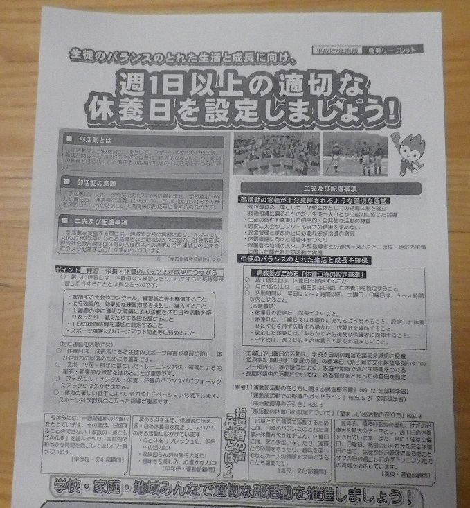 今まで部活の休みなんてあってないようなもので、月に数回、しかも平日休みがほとんどでした。なので丸一日の休みがほぼなく、家族での予定が立てられなかったんです。それが先日、学校から↑のプリントが配布されて今度から週1日は必ず休み。月に1回は土日のどちらかが休みになるっていうじゃないですか長男は「これでまた、公立と私立の差が開く」って複雑な心境でしたが、姫ちゃんは「今度から友達と遊べるね♪」と喜んでいました。部活動については指導方法(暴力など)が問題になったりしてましたし、↓先生の勤務時間の問題<教員勤務実態調査>中学教諭、6割近くが「過労死ライン」もあるので、今回の改革はある意味当然のように思いますね。それでなくても、今の子どもたちは時間に追われ過ぎてるように思いますから。小さいころからたくさんの習い事や塾での勉強、中学高校では部活動に受験勉強も加わって大変大学進学したら今度は就活、大人になってからは仕事に追われ、なんだか、日本人全体がせかせか時間に追われてる印象ですねファミレスが24時間営業をやめる方向になっていますが、コンビニやその他のお店も24時間営業をやめればいいのにと思います。便利さと追及すると、人手不足や過重労働・超過勤務を増長させるし、エコではないですよね。一昔前のように夜間や年末年始はお店がどこも開いてなくて家でのんびり過ごすという生活に戻せば、環境にもやさしいし何より人間らしい生活ができるように思います。