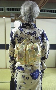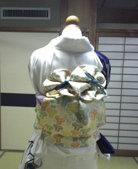 昨日は着付け教室でした。今回、麻の長襦袢を始め、足袋、裾除け、半襦袢など、洗濯したもの一式をカバンに入れ忘れてしまいましたなので、着物を長襦袢なしの浴衣のように着ました。(自分の写真は撮り忘れました)まずは、素敵な浴衣を着てるSさんにモデルをお願いして帯結び左がお雛様。形が不格好になりましたが、お太鼓の左右に出ているのがお袖だそうです。右の写真は風車。グリーンの帯締めを飾りに使って色が鮮やかになったでしょうか?でも、お太鼓が大きすぎて不格好なのが残念です まだまだ、練習あるのみですね。 こちらは、Hさんが結んだ???帯結びの名前を忘れてしまいました(~_~;)垂れが三角に出ていてお太鼓の上には4枚の羽根があり豪華 振袖にも映えそうですねモデルのUさんの浴衣も素敵楽しいひとときでした