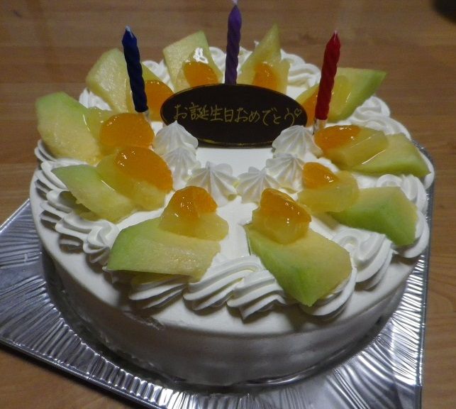 昨日は私ダメ子の誕生日でした家族みんなでお祝いしてくれましたえっと、ろうそくは3本ですが年とは関係ないです。旦那さんが、ケーキ屋さんに2本って言ったら「2本じゃ寂しいから3本にしましょう」って言われて3本になったらしいですちなみに旦那さんからの誕生日プレゼントは、私がずっと欲しがっているボディを買うためのお小遣いでしたこの年になるとお小遣いをもらうこともないので、うれしかったです。そして、ちびさんは図書館で借りてきた本を見てフルーツ寒天を作ってくれました初めての料理?で、姫ちゃんに手伝ってもらいながら頑張ってました。出来上がりは、寒天の粉がきちんと溶けてなくて少し粉っぽく固まり具合も微妙でしたが、みんなでワイワイ言いながら美味しくいただきました 夕方、部活から帰った姫ちゃんは疲れているはずなのにちびさんの寒天作りを手伝ってくれて、プレゼントには私の好きなキャラクターのオリジナルクッキーをくれましたケーキ屋さんにお願いして作ってもらった世界に一つだけのクッキーですそして、長男ですが。今日も塾で遅いかなぁなんて思ってましたが、8時頃に帰ってきてくれて「お菓子」をプレゼントしてくれましたミニケーキなんですが、本人はお菓子と言い張ってました。きっと、誕生日忘れた前科ありの旦那さんがケーキを買い忘れたらいけないと思ってケーキの代わりになるものを考えてくれたんだと思います。日頃は母に対して素っ気ない態度を取る長男の優しさ(母への愛!?)を感じました今までで一番幸せな日を過ごせました ← きっと、これからも更新されて行くでしょう。みんな、ありがとう!!そうそう、旦那さんからもらったお小遣い、私の好きな猫柄のポチ袋に入っていました。しかも、裏を見るとシールは着物なんです今日の旦那さんは、いつもとちょっと違う女心(私心)のわかる素敵な男でしたよ