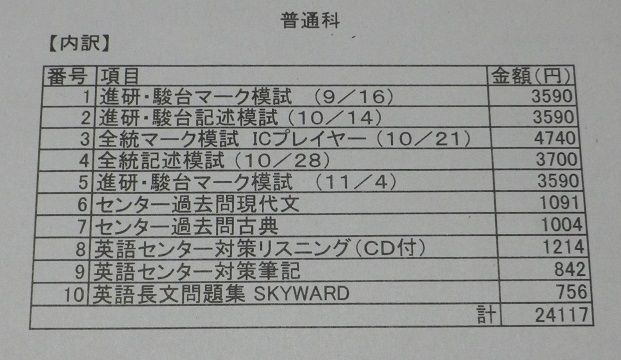 我が家の長男は今年、受験生です。センター試験の申し込みの時期なんですが、一応進学校なので学校で取りまとめて送ってくれるようです。昨日、センター試験の受験費用を支払ってきました。18,800円(3教科以上、成績通知を希望)受験するだけでこの金額がいるんですね。センターの後、二次試験があるのでそれに17,000円。前期、後期と受けるでしょうから実際には×2の、34,000円。それから二次は会場が遠くなるので、交通費と宿泊費で1回に約50,000円。実際は×2で、100,000円総額、152,800円(センター入試含む)我が家は私立はダメと言ってあるので国立しか受験しないからこの金額だけど、私立も受験する人は願書を取り寄せるだけでもお金がかかるらしいから大変。学資保険は合格してから必要だし、受験前には間に合わないし親は大変です。合格後も、入学金や学費、遠方だと部屋代(敷金礼金他)などの生活準備費用などなど、羽が生えて飛んでいくようです参考までに → 受験にかかるお金 → 意外とかかる大学受験費用ちなみに我が家は長男が高2の冬、12月から塾に行き始めて既に約37万円支出しています改めて計算すると恐ろしい金額ですね。受験まで約半年...とにかく、合格してくれることを祈るばかりです