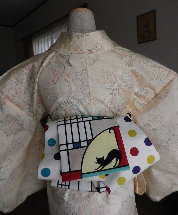 朝、結んだ半幅レイヤー。ポリの帯だったからか結び目が緩んでくるので、試しに正絹で結んでみました。水玉と猫のリバーシブル (400cmくらい)緑の変わり織(350cmくらい)着物リメイクの柔らか帯(400cmくらい)正絹の帯でもやっぱり、結び目が緩みやすい感じです多分ですが、結び目と胴に巻いた帯の間に、屏風折りした垂れを押し込むように入れるという結び方が結び目を緩めやすくするんだと思います。そんな中でも、一番結びやすく緩まなかったのは着物リメイクの帯ですね。実際は30cmくらいの幅があるものを半分に折って巻いているのですが、柔らかく結びやすいのでぎゅーっと締めて余った手も垂れのように見せてしまえば形も綺麗で良かったです。それと帯は、長い方が垂れの形が整えやすくて仕上がりが綺麗です。帯によって柄の出し方や、垂れの位置など考えると簡単ながらもお洒落な感じに出来上がります結び目が緩まないようにさえすれば、初心者でも簡単に結べるのでお勧めですついでに、木綿の変わり織りの帯でも結んでみました。柔らかいからどうかなぁと思いましたが、思いのほか可愛らしくなりました。この結び方には、この帯が一番しっくりきたと思います。木綿の変わり織り(400cmくらい) 帯結びに使用したもの:帯板、半幅帯(長めの方が垂れが整えやすく綺麗)
