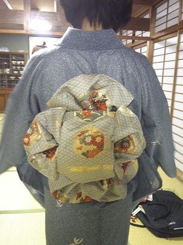 旦那さんが勝手に名前を付けてからというもの、子ども達までが「ぽてこ」と呼ぶ始末昨日も「ぽてこ、帯だけ結んだら変だよ。着物着せてあげたらいいのに」って言われました。なかなかぴったりくる名前が思いつかない私も悪いんですけどね。もう、ぽてこでもいいかなぁと妥協し始めた今日この頃です。早速みんなが起きる前に、ぽてこさんに紬の着物を着てもらいましたよ。おなじみのヤフオクで手に入れたものです。紬とのバランスはですが、練習で袋帯を使って花車を結びました。まあ練習なので もちろん、自分が着る時はこんな組み合わせしませんが家ではなんでもありですねちょっと、羽根が大きすぎてバランス悪いです 帯結びに使用したもの:帯板、袋帯、帯枕、帯揚げ、帯締め、トリプル紐、ゴム2本、飾り紐あっ、前回の着付け教室でお太鼓の上の羽根を横向きにしていたんですが先生に訂正されましたこちらの写真のように縦が正解でした。下の写真は左が正解で、右が教室で間違った時のもの。羽根を大きくし過ぎてバランス悪くなったのもあるけど、横向きの方が可愛くて私は横の方が好きかなぁ 正解(縦向き) 間違い(横向き) ちなみにずっと前に教室で結んだのが、これ↓ あれ?羽根が小さいと可愛い やっぱり羽根の大きさは大事みたいですね。まだまだ練習というか、修行が足りないことがばれてしまいましたぽてこもいることだし、練習しっかり頑張らないといけませんね