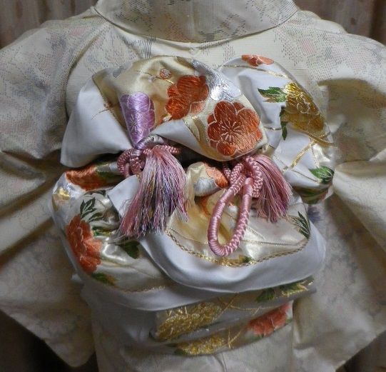 菊唐草と言う結び方だそうです。帯が違うと雰囲気が全然違いますね~ちなみに私が結んだものは左の写真ですが、ちょっと形がいびつになってしまいました それから、来年の新年会の発表用に結んだ花車。今までずっと、風車と思っていたんですが花車が正解だとのことでした。毎回、飾り紐の結び方に悩みますがやっとコツをつかんできた感じです いい感じでしょ家に帰ってすぐ、忘れないうちにとボディに菊唐草を結んでみました着物も着せずに、帯だけ結んだのでちょっと変な感じですが練習なので良しと言うことで。同じ結び方でも帯のデザインによって全く表情が違ってきます。やっぱり、変わり結びには派手目なものや華やかな柄行の物の方が映える気がしますね。