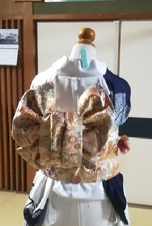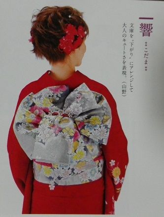 先日、今年最後の着付け教室がありました。が、急に他市での仕事が入って帰りが遅くなってしまったために、まともに行けず新年会の申し込みの締切日でもあったので、それだけ持って遅れて行きました。ちょうど行ったら、Hさんが来年の新年会に向けて一人で変わり結びの練習をされていました。文庫の変わり結びでとても可愛らしく素敵なんですが、前で結んで後ろにくるっと回す時にどうしても羽根の形が崩れてしまいます。回した後では自分で手直しするのが難しいので、会場で他の方に手直ししてもらわなきゃいけないねって話をしていました。ところが、先生が「新年会に結ぶ帯結びは考えておくわね」とそういえば前回も、教室全員が先生の指示で同じ帯結びしたんでした。私は昨年が初めてでしたが、どうも毎回そんな感じのようでこの教室の生徒はお揃いの帯結びみたいです。新年会は、先生の教室3つの合同で他の2つの教室は生徒さんみんなそれぞれ好きな帯結びをされていました。なので、どうしてこの教室だけお揃いなんだろうと思った記憶があります。きっとHさんも自分で好きな形に結びたかったんだと思うんですよね~。日頃、そんなに着物着て出かける機会は無いんですから、せっかく教室で習ってるんだし新年会くらいは華やかな帯結びしたいじゃないですか。私自身、好きな帯結びしたいと思いますもん。先生の言葉に少し残念そうなHさんでしたが、先生は気付いてないようでしたお年のせいか耳が少し遠いようで、私たちの声が聞こえてないのかもしれませんね。今年の教室はもう終わりましたが、年明けて新年会までに教室が2回あるので先生に好きな帯結びしたい!って改めてお願いしてみようかなと考えていますちなみにHさんが練習していたのは、これに似た感じでした↓