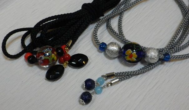 最近、手に入れたトンボ玉付きの飾り紐は、それぞれ端にサンゴとラピスラズリが付いていていい感じ
