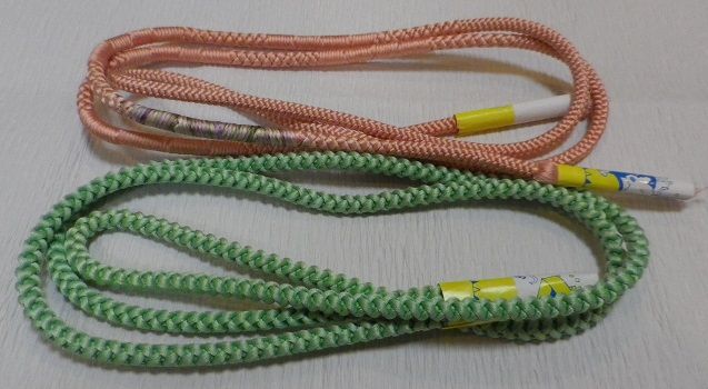 ↓左は平組だけど細めで飾り組してあるから飾り紐に使えるし、右の丸組は色がきれいなので飾り紐に使うと帯に映えます