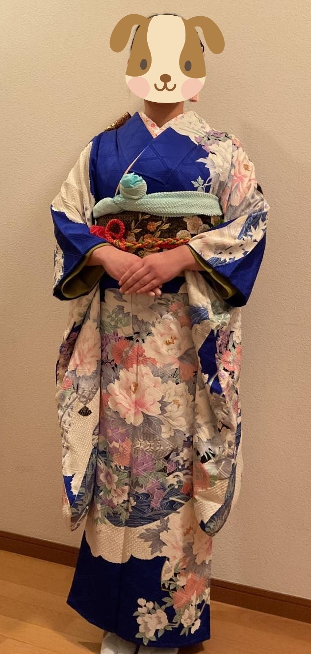 右 = 和裁教室の方から頂いた青い振袖 素敵な振袖頂きました (人''▽`) ありがとうございます!!