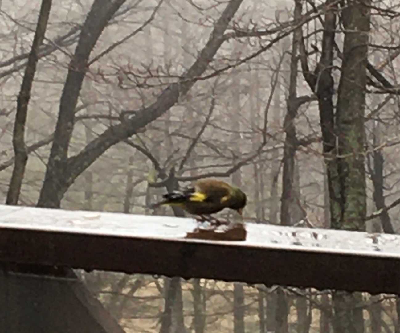 カワラヒワという鳥です。いつもの顔ぶれが少しの間いないすきにやって来て、手すりに暫くいました。コガラなどより一回り大きな鳥です、ちょっとキツい顔してます。