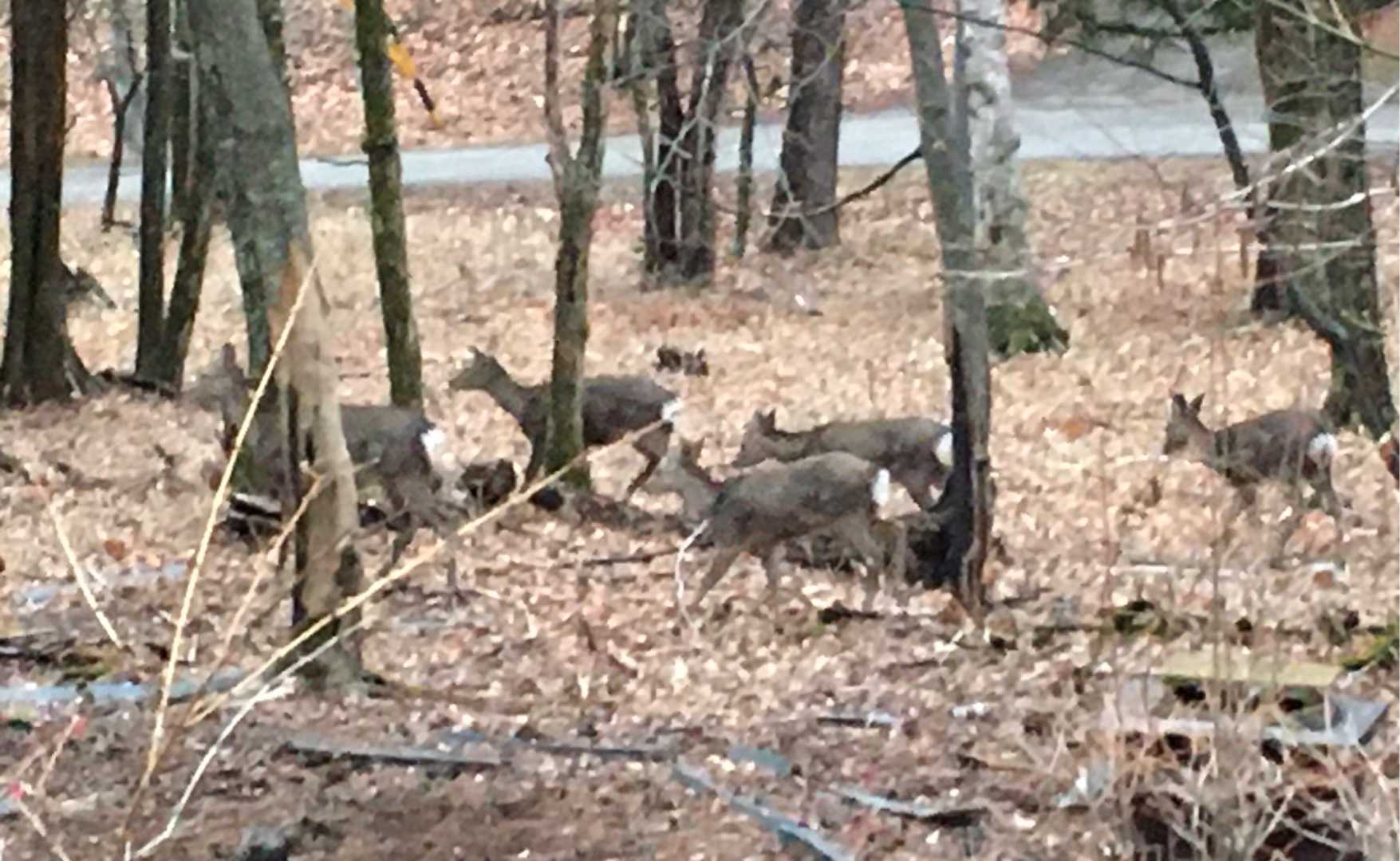 雨の日はさすがに鹿などの動物は見かけませんが、二、三日前、夕方いきなり車の前に鹿が飛び出し危なかったことがあります。お母さん鹿らしく、すぐさま向きを変えて子供たちのところへ戻りました。その時撮った写真です。わかりにくいのですが、3、4頭の子鹿?がいます。