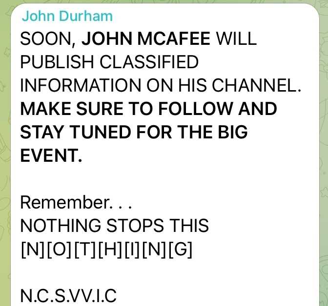 すぐに、ジョン マカフィーが彼のチャンネルで機密事項を暴くだろう。彼のチャンネルをフォローして大きなイベントに備えてください。