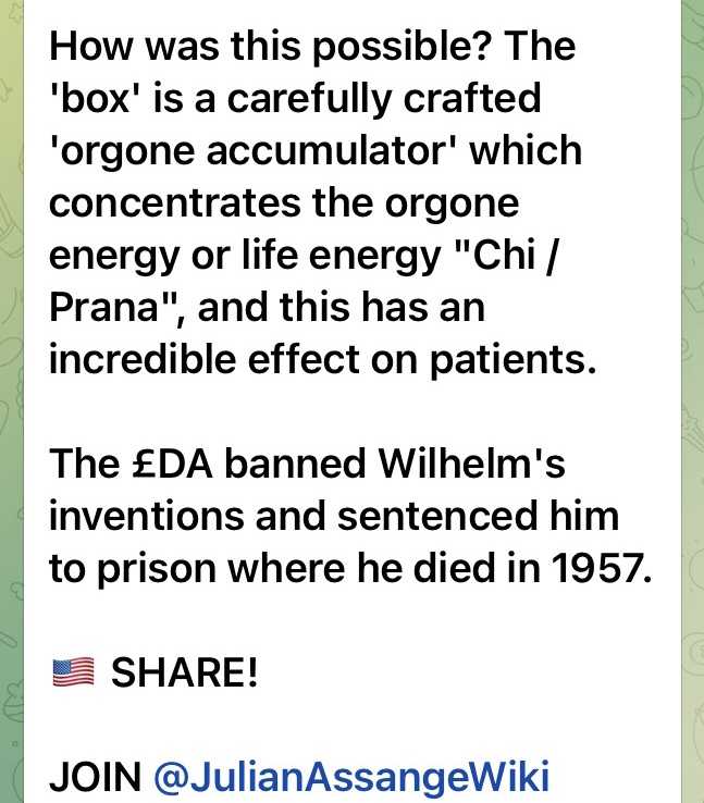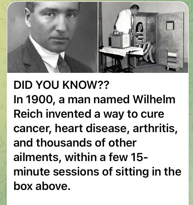 1900年、ウィルヘルム ライヒという名の一人の男性が、癌、心臓病、関節炎、他何千種類の病気の治療法を開発しました。上の写真にあるように、箱の中に15分程度座っているだけです。