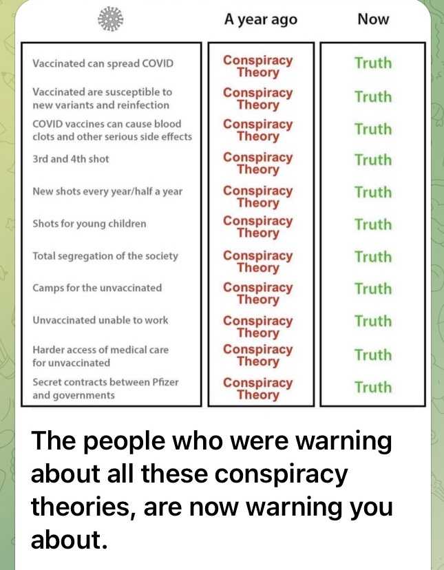 (表):ワクチン接種者がコロナを広める。(→ 全て以前は陰謀論、 今は真実、以下省略)