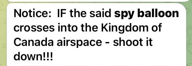 通告:もし言われているスパイ気球がカナダ王国領空に入って来たら - 撃ち落とせ!!!