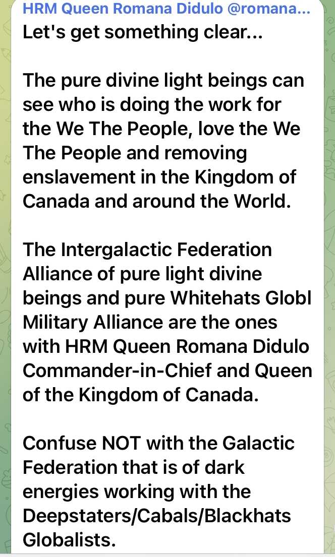 純粋な光の存在の銀河連合アライアンスと、純粋なホワイトハット世界同盟軍は、カナダの最高司令官であるクイーンロマーナディデューロと共にいます。