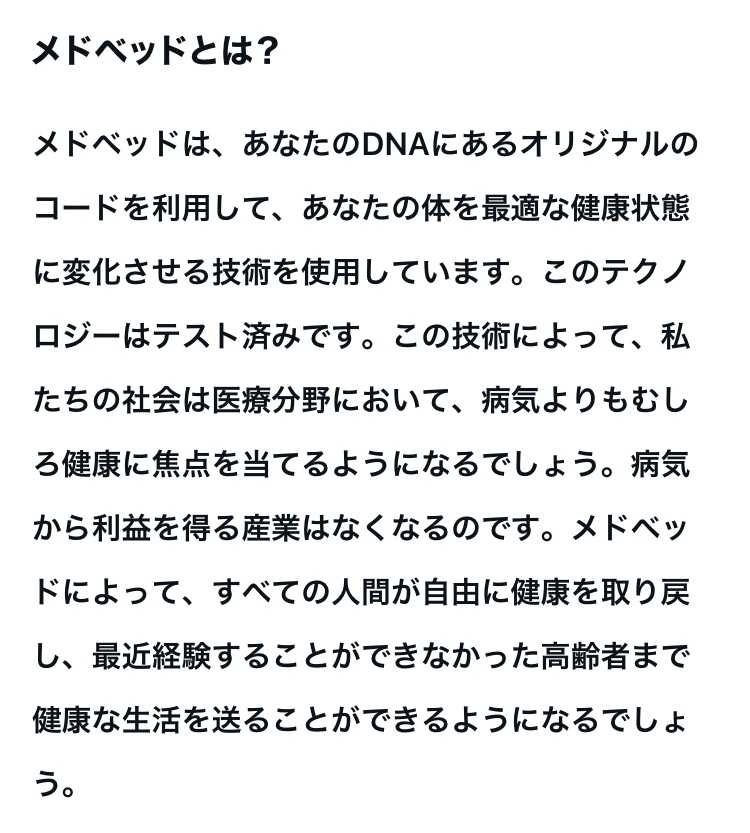 2022年に書かれたこの記事の中で、メドベッド技術、費用、運用、治療などに関して詳しく述べられていますが、まだまだわからないことだらけです。ただ世界中でメドベッドは軍が管理しているそうですから、一昨年ごろからネット上に出ているメドベッドなどの画像や体験談などは全部フェイクだと思います。