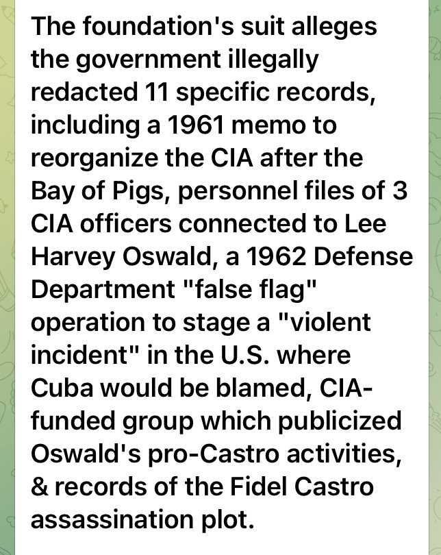 この財団の訴えは、ピッグス湾事件後のCIAを再編成するための1961年のメモ、リー・ハーヴェイ・オズワルドに関係する3人のCIA職員の人事ファイル、キューバが非難されるような「暴力事件」を米国で演出するための1962年の国防省「偽旗」作戦、オズワルドの親カストロ活動を公表したCIA資金提供団体、フィデル・カストロ暗殺計画記録など11件の特定の記録を政府が不正に編集したと主張する。