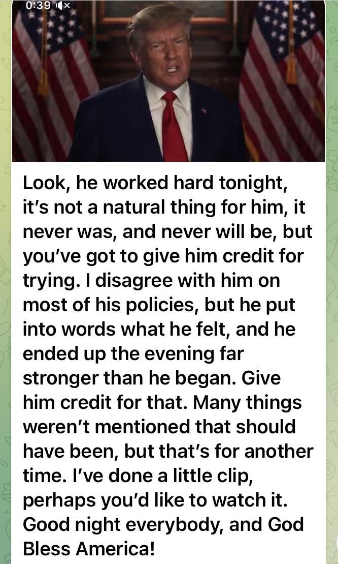 そうだ、彼(バイデン)は今夜よくやった、彼にとって大変なことだった筈だし、これからもそうだろう。しかし、とにかくやってみたことに対してクレジットをやろう。私は彼の政策の殆どに反対だが、彼は思いを言葉にしたのだ、そして最後には始めた時よりも強い調子になった。そのことにクレジットをやろう。多くの問題は言及されなかったが、その件に関してはまた別の機会に。私は短い動画を作ったんだ、みんなも見たいだろう。