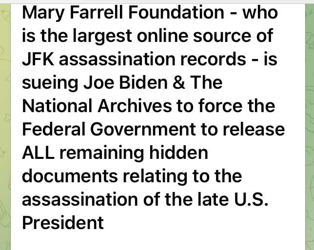 JFK暗殺の記録に関する最大のオンライン情報源であるメアリー・ファレル財団は、ジョー・バイデンおよび国立公文書館を訴え、合衆国大統領暗殺に関する残りの隠し書類全部を公開するよう連邦政府に要求している。