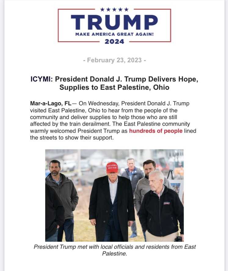 Mar-a Lago,フロリダ ー 水曜日、トランプ大統領は東パレスティンを訪れて、コミュニティーの人々から話を聞き、列車脱線事故の影響を受けた人々に救援物資を渡しました。何百人もの東パレスティンの人々が沿道に立ち、トランプ大統領を迎え支持を表しました。